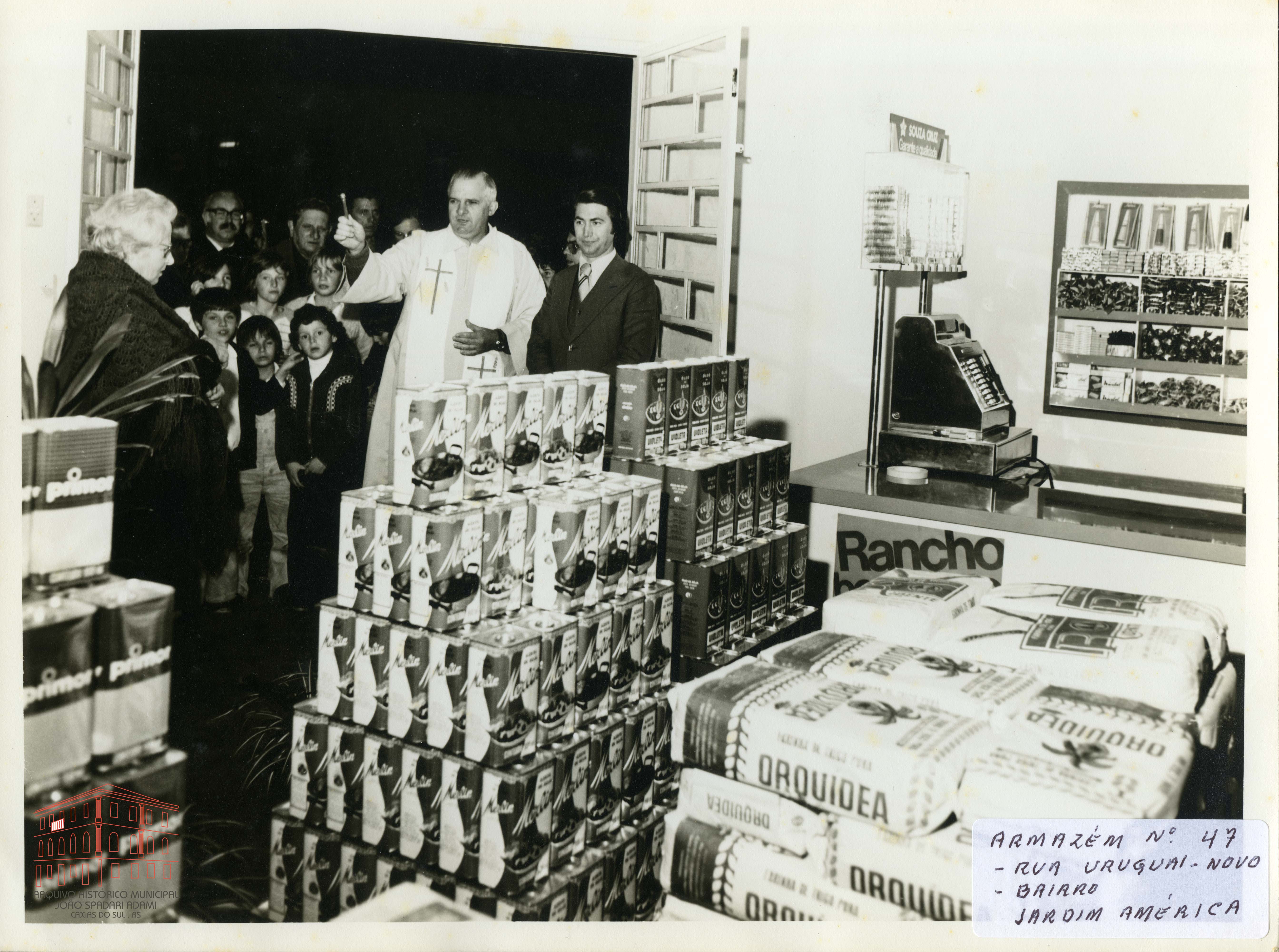 Paulina Soldatelli Moretto, Sacerdote e Prefeito Mário David Vanin na inauguração do novo prédio do Armazém Popular Nº 47, localizado na rua Uruguai nº 301, bairro Jardim América - Caxias do Sul