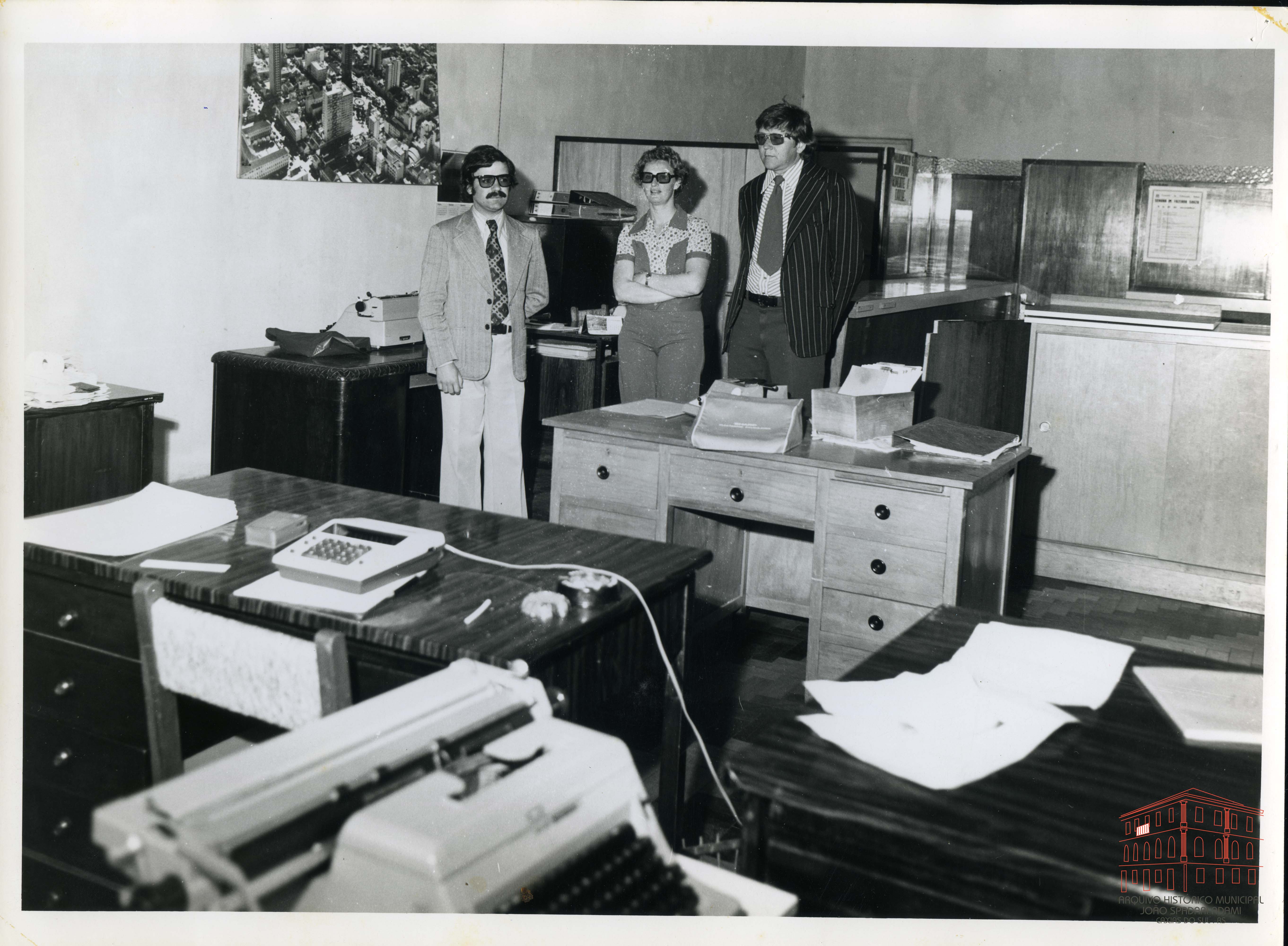 Nestor Antônio Perotoni, Presidente da Câmara Municipal de Vereadores, na data, Prefeito em Exercício, Diretora Laís Moretto Kuser e Celso Schoerpf no escritório do DMAP, situado na rua Luiz Michielon no bairro Cruzeiro - Caxias do Sul