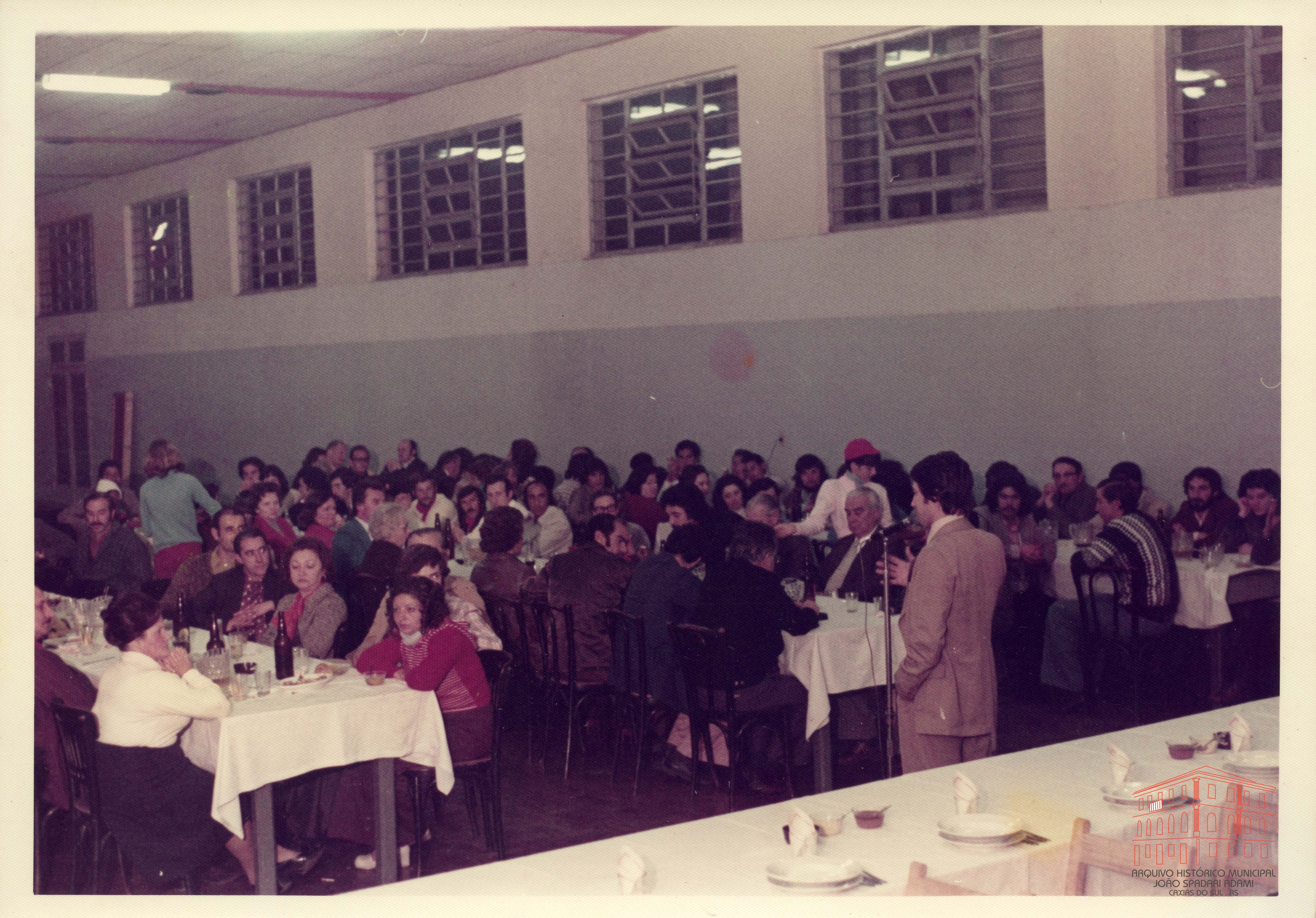 Ao microfone, Prefeito Mario David Vanin, no Almoço em Comemoração dos 23 anos dos Armazéns Populares no Salão Paroquial da Igreja Nossa Senhora de Lourdes, localizado na rua Angelina Michielon, bairro Nossa Senhora de Lourdes - Caxias do Sul