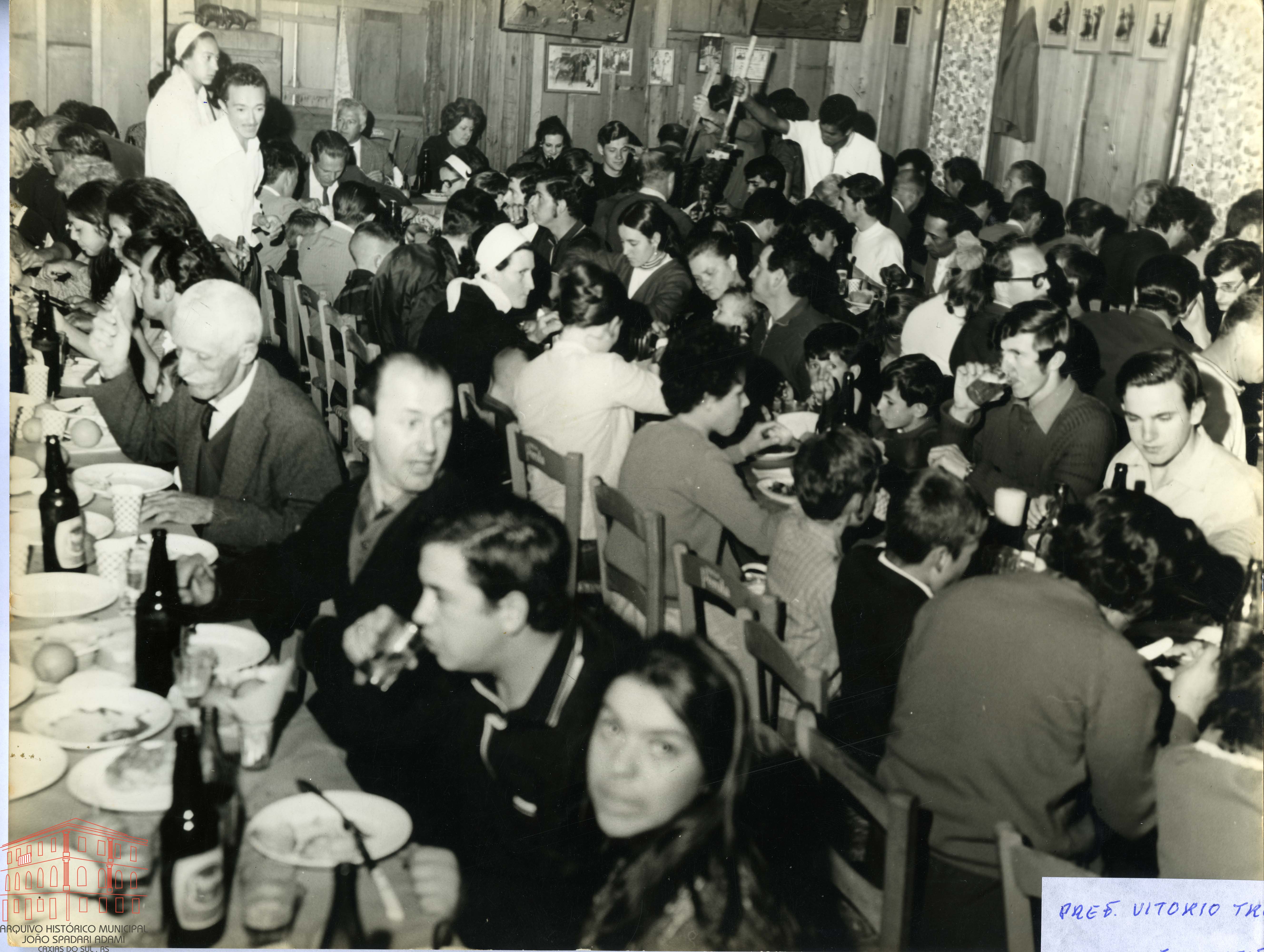 Na cabeceira da mesa, Prefeito Victorio Trez e esposa Arilde Trez participando de almoço - Caxias do Sul
