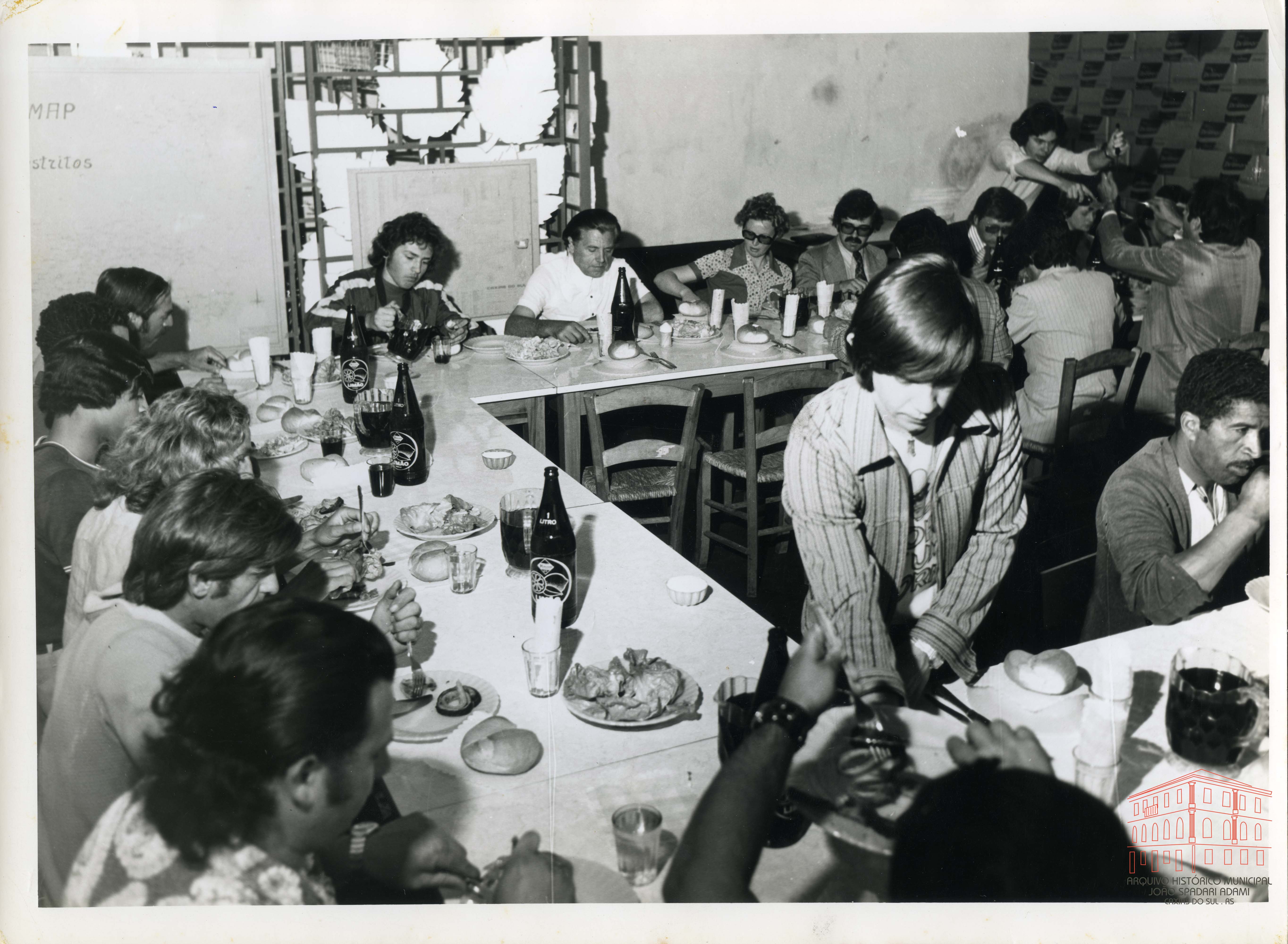 Ao fundo, sentados, Diretora Laís Moretto Kuser, de óculos, Nestor Antônio Perotoni, Presidente da Câmara Municipal de Vereadores, na data, Prefeito em Exercício e Celso Schoerpf em almoço com funcionários do DMAP, situado na rua Luiz Michielon no bairro Cruzeiro - Caxias do Sul
