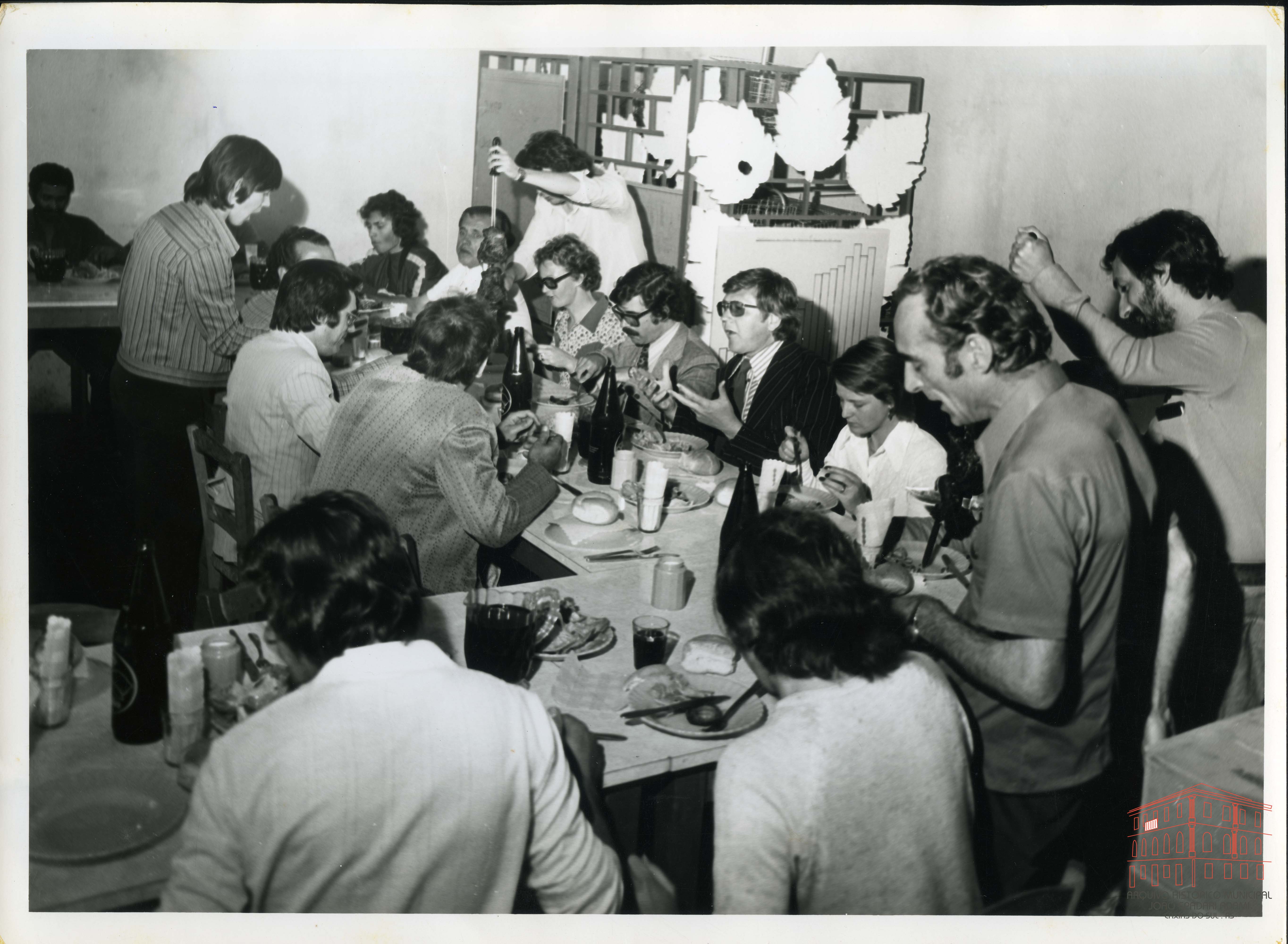 Diretora Laís Moretto Kuser, de óculos, e Nestor Antônio Perotoni, Presidente da Câmara Municipal de Vereadores, na data, Prefeito em Exercício em almoço com funcionários do DMAP, situado na rua Luiz Michielon no bairro Cruzeiro - Caxias do Sul