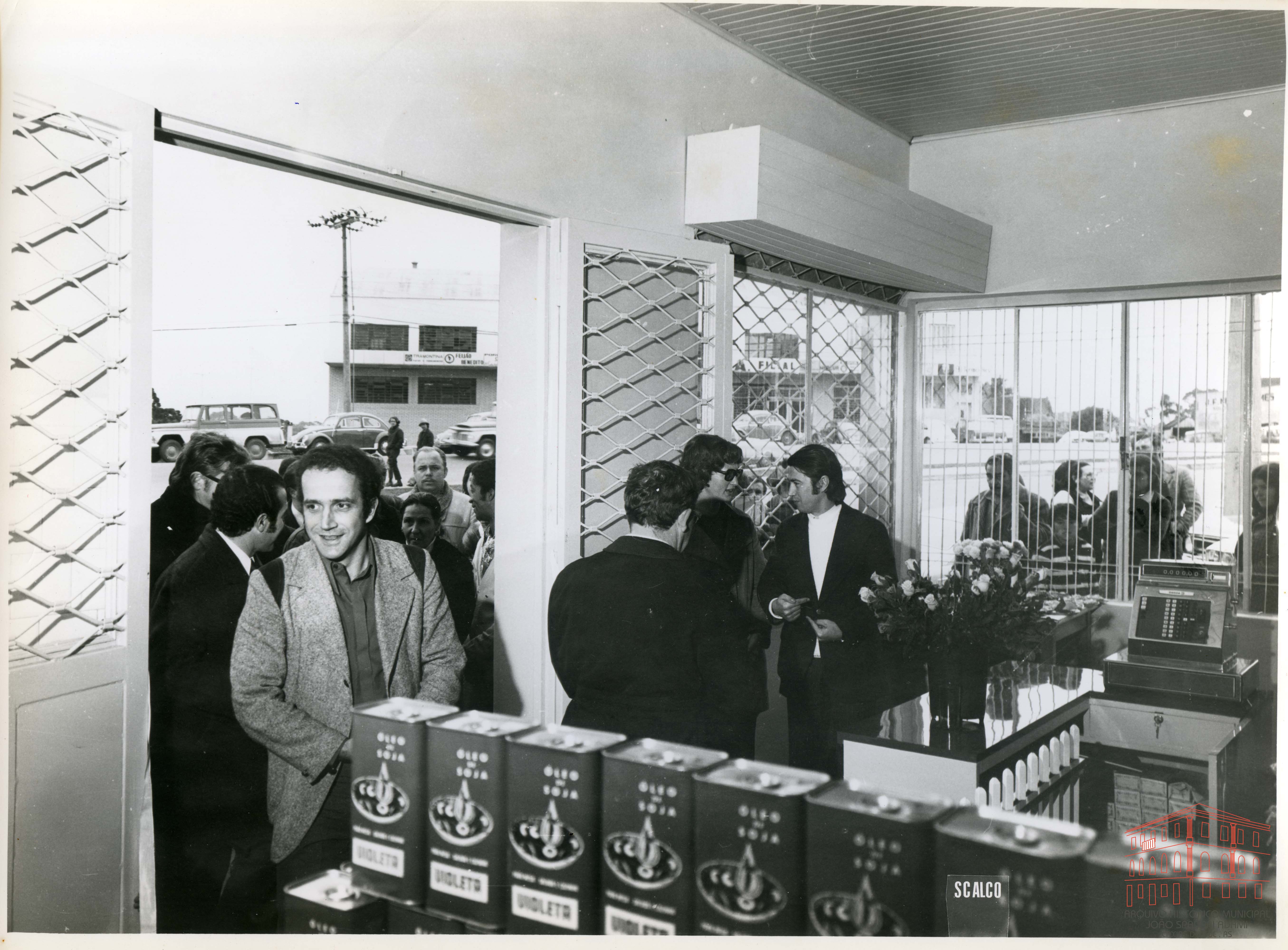 Ao centro, Vice-prefeito Mário David Vanin e Laís Moretto Kuser, Diretora do DMAP, em 27 de julho de 1973. Na entrada do armazém, Giovani Zanetto, Diretor do SAMAE
