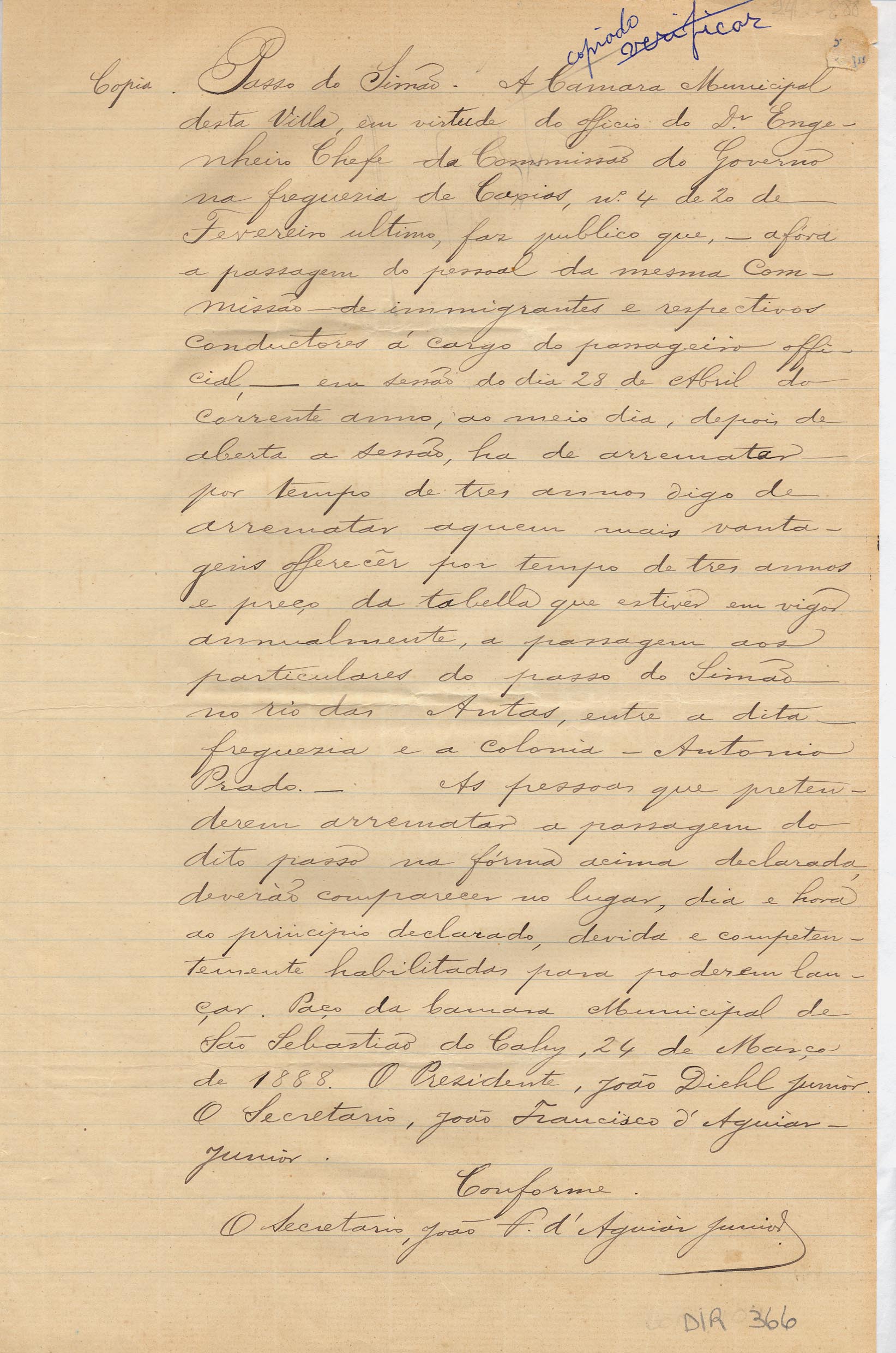 Cópia de Edital da Câmara Municipal de São Sebastião do Caí - João Diehl Júnior. - Presidente e João Francisco D'Aguiar Júnior. - Secretário. Assunto: arrematação da passagem do Passo do Simão, Rio das Antas, entre freguesia de Sta. Tereza de Caxias e Antonio Prado. Local: São Sebastião do Caí.