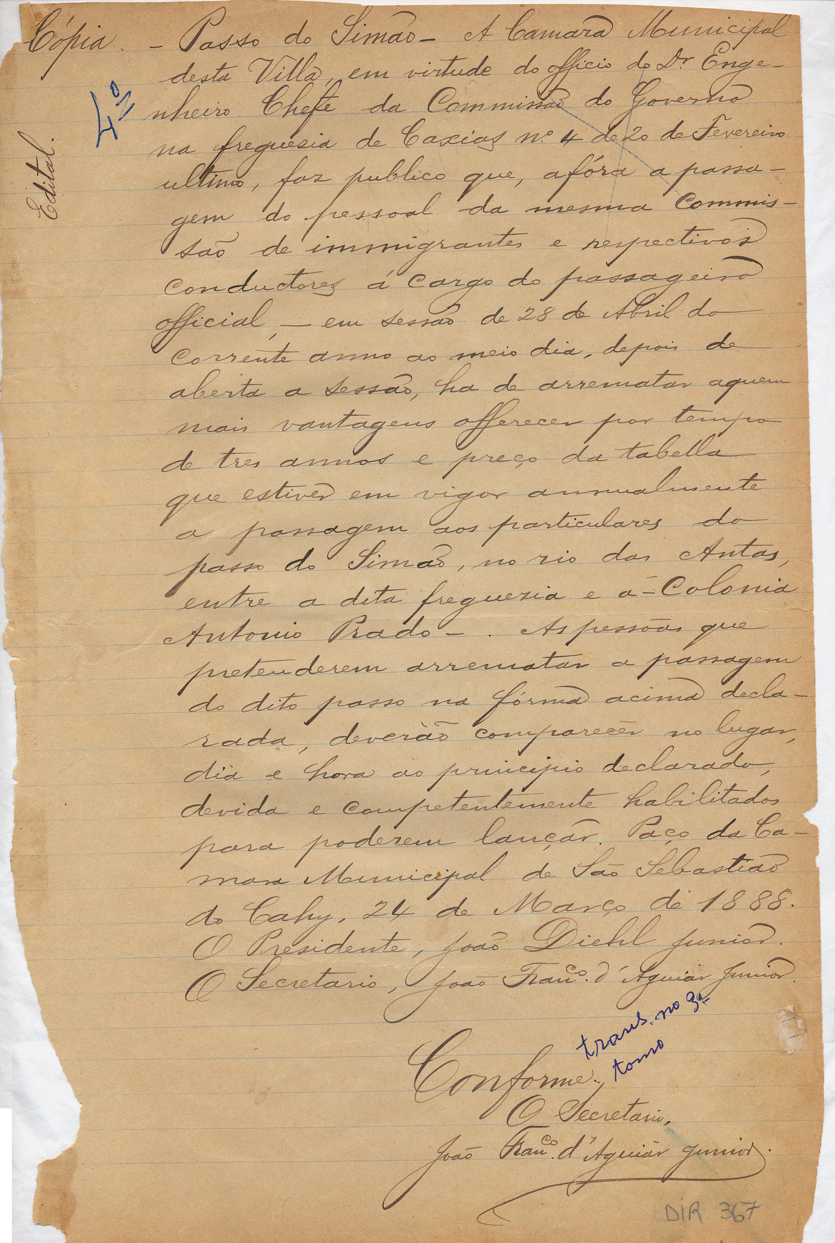 Cópia de Edital da Câmara Municipal de São Sebastião do Caí - João Diehl Júnior. - Presidente e João Francisco D'Aguiar Júnior. - Secretário. Assunto: arrematação da passagem do Passo do Simão, Rio das Antas, entre freguesia de Sta. Tereza de Caxias e Antonio Prado. Local: São Sebastião do Caí.