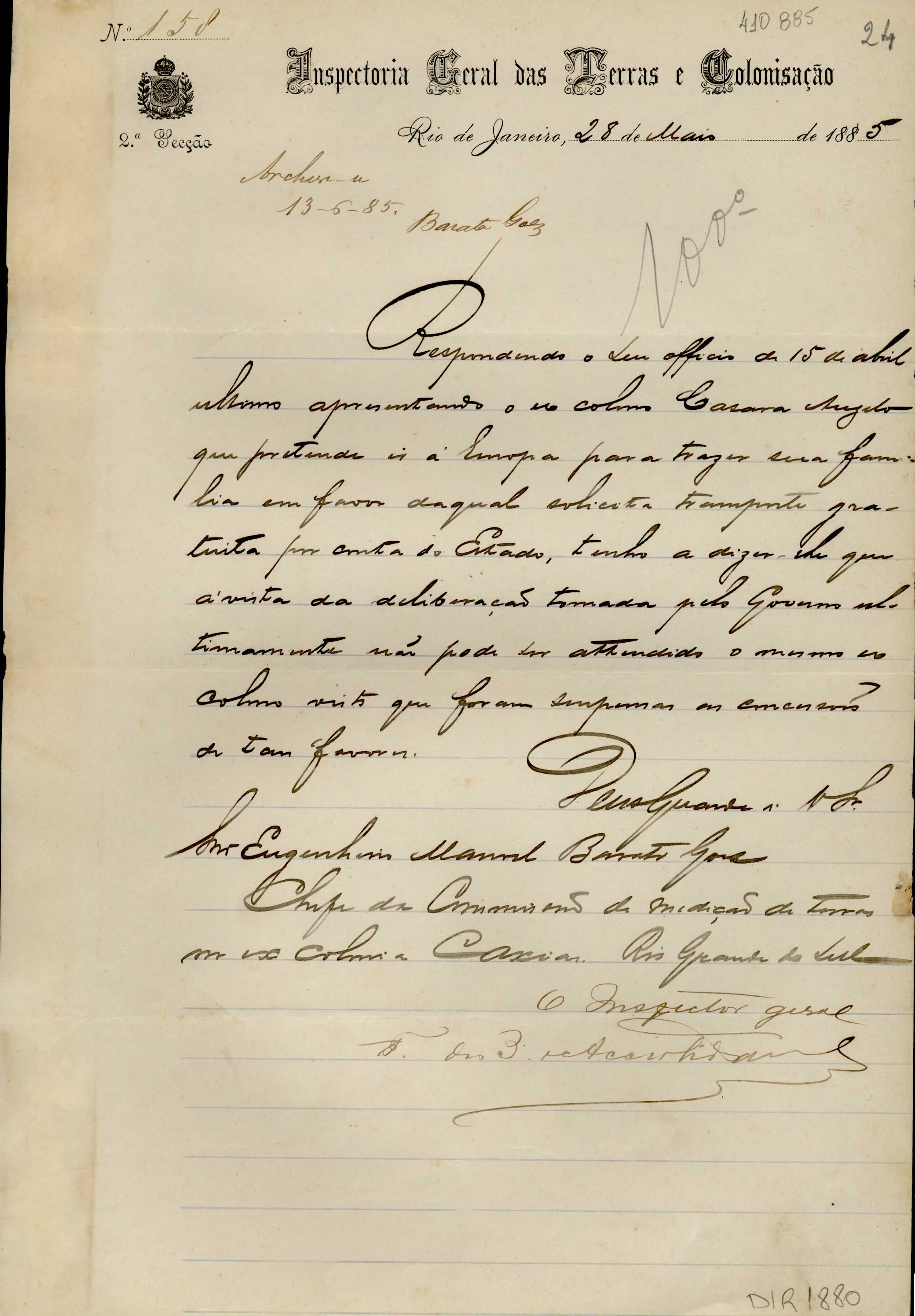 De Francisco de Barros e Accioli de Vasconcellos - Inspetor Geral das Terras e Colonização no RJ, para Manoel Barata Góes - Engenheiro Chefe de Medições na ex-Colônia Caxias. Assunto: comunica deliberação do governo sobre transporte do imigrante Casara Angelo, para buscar sua família na Europa.