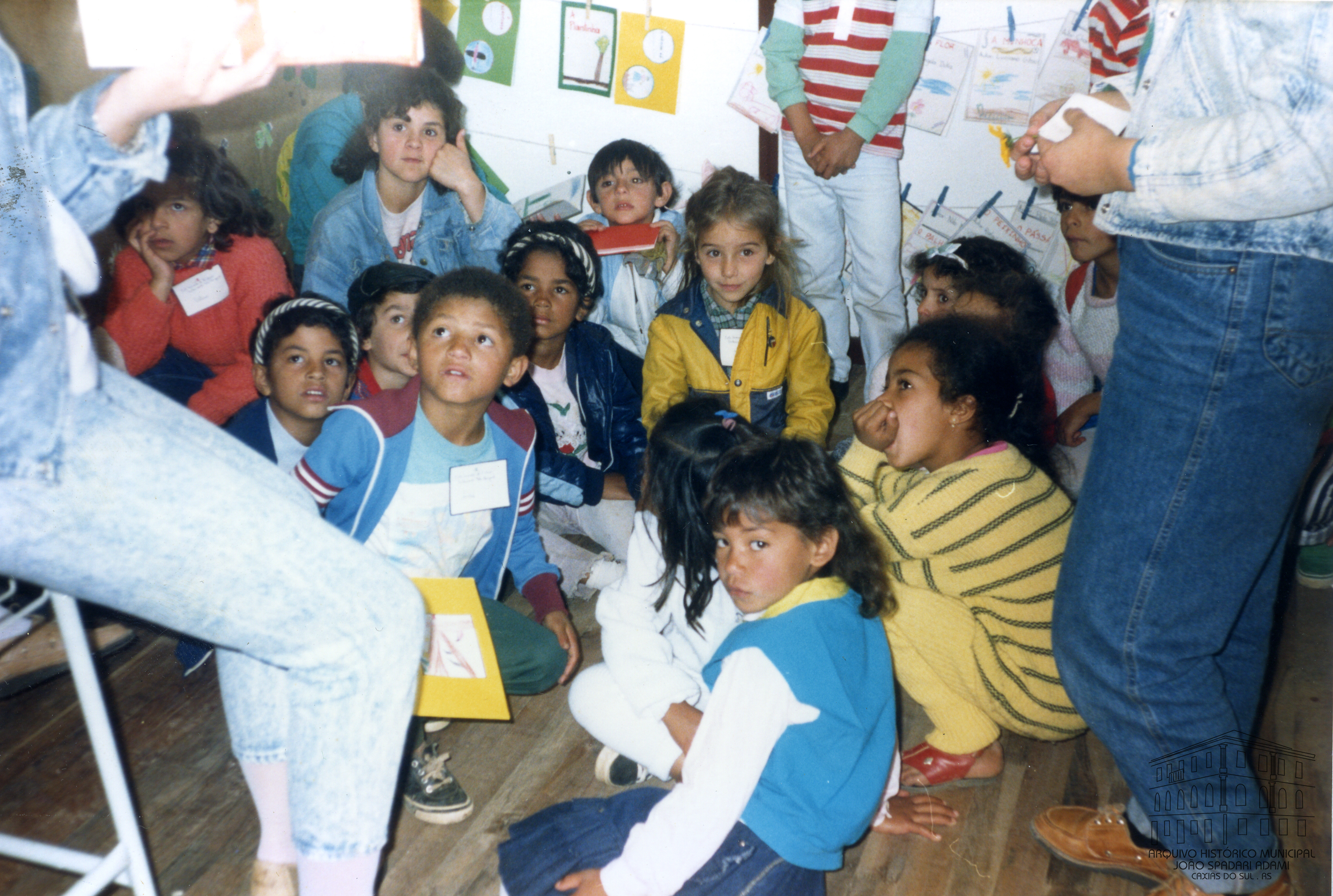 Alunos da Escola Municipal Presidente Tancredo de Almeida Neves em visita ao espaço da Secretaria Municipal da Educação e Cultura na Feira do Livro, ocorrida de 18 a 22 de outubro de 1988,na Praça Dante Alighieri.