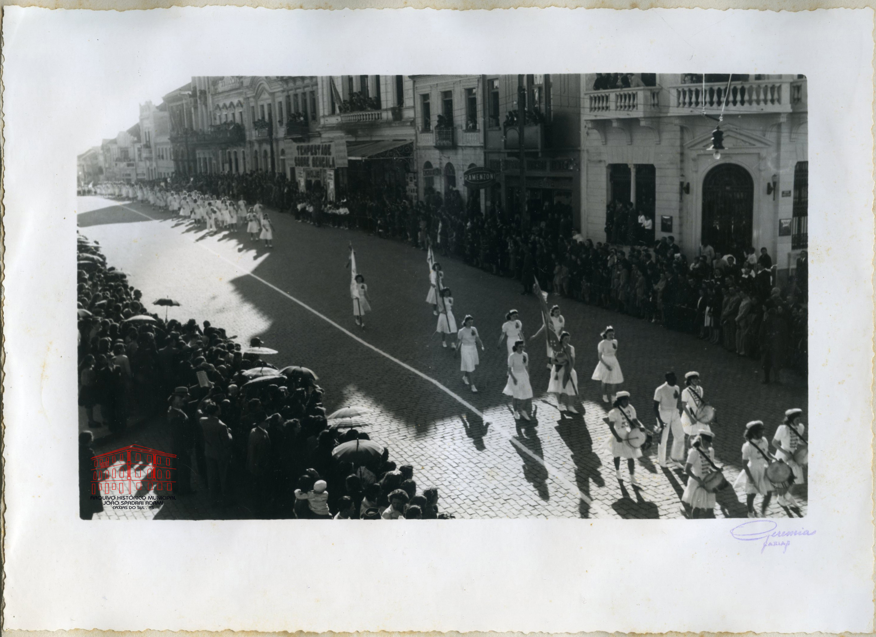 Alunos da Escola Complementar no desfile da Semana da Pátria na Avenida Júlio de Castilhos, em frente à Praça Dante Alighieri, no dia 07 de setembro de 1941. No primeiro plano, o grupo de tamboreiras, formado por alunas da Escola, na sua primeira participação em desfile cívico.