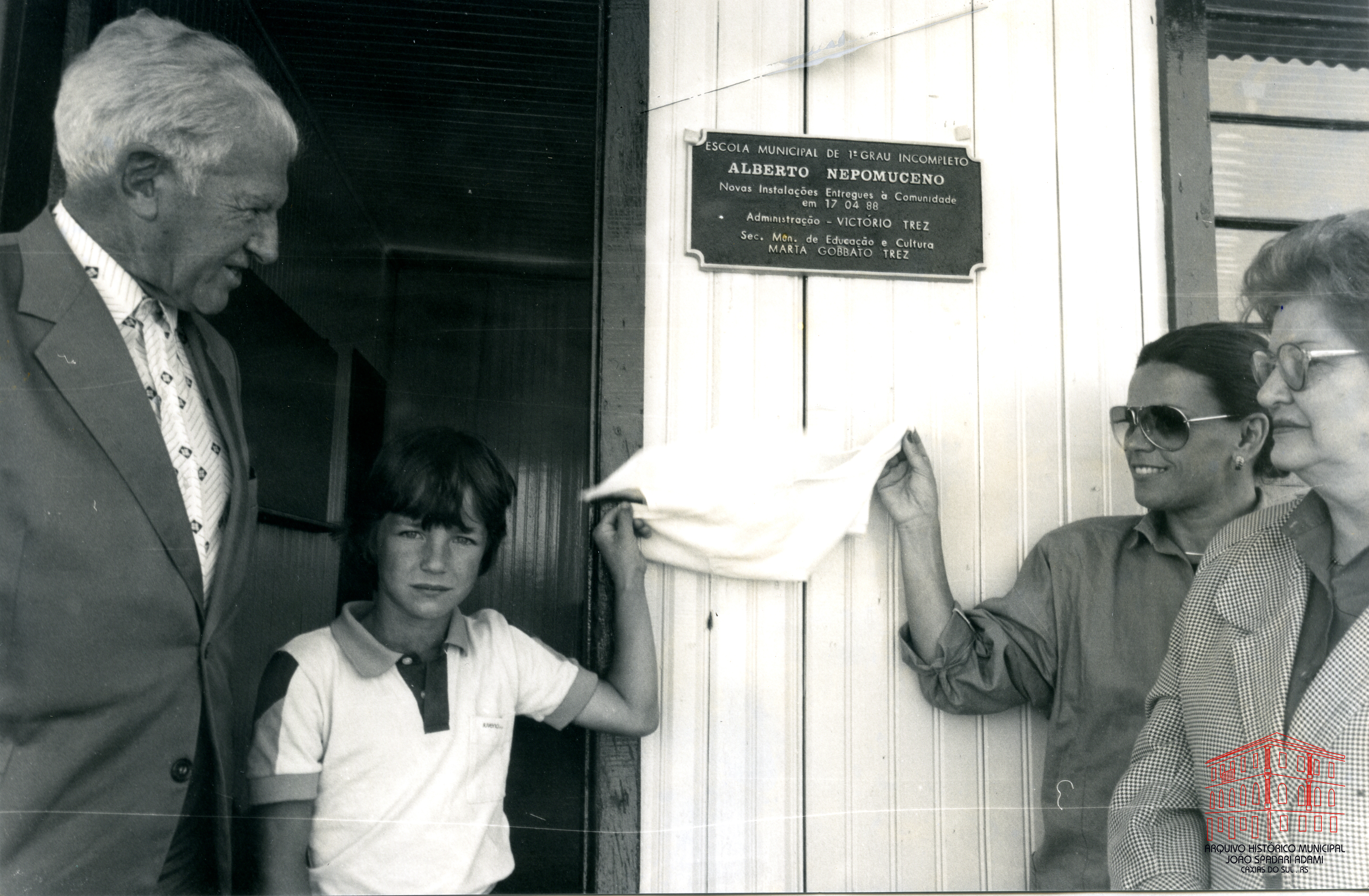 Prefeito Victorio Trez, Secretária Municipal da Educação e Cultura Marta Gobbato Trez e Arilde Trez, esposa do Prefeito, no descerramento da placa de inauguração da Escola Municipal Alberto Nepomuceno localizada em Rincão Novo, distrito de Vila Oliva, em 17 de abril de 1988.