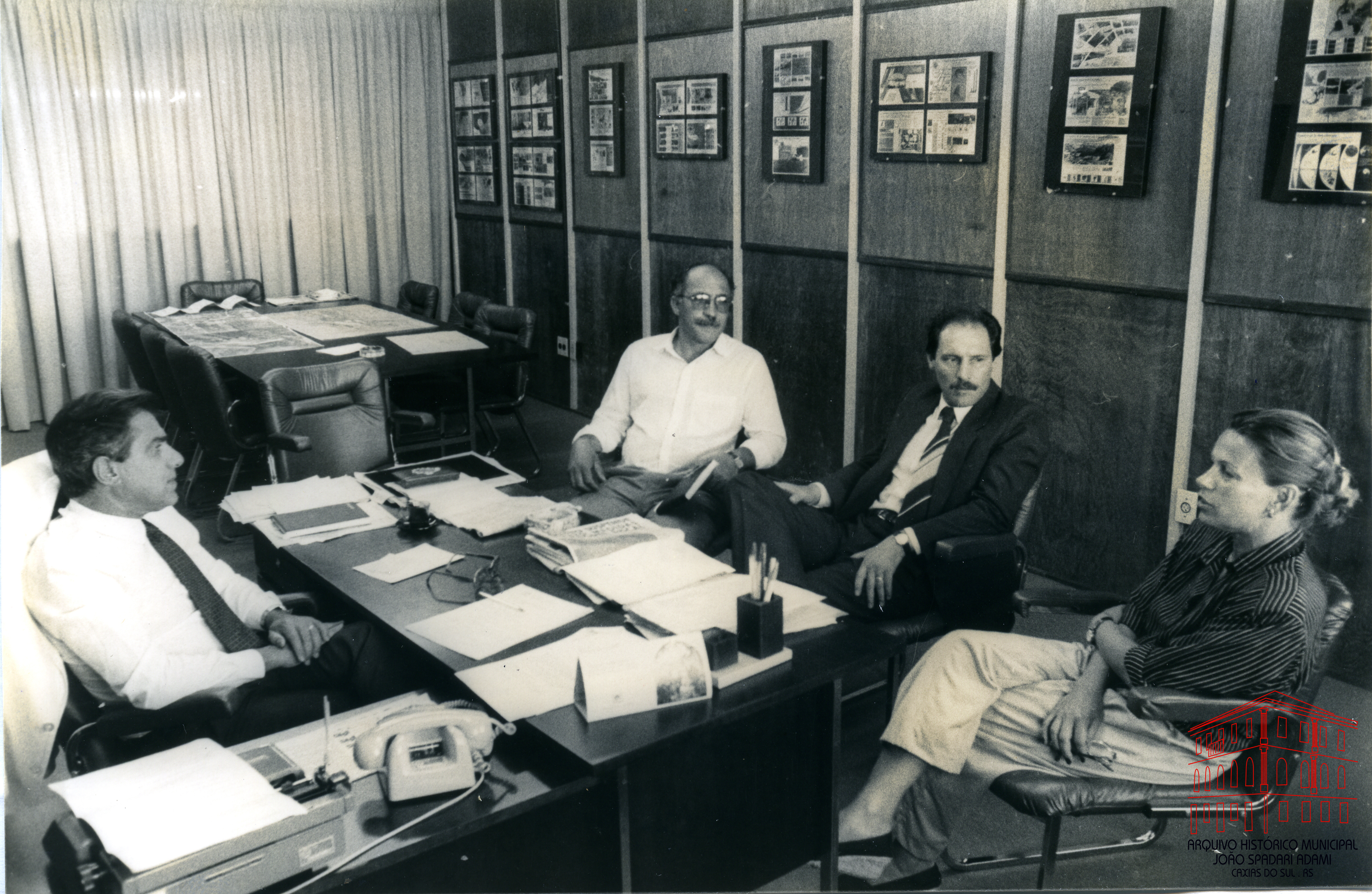 Reunião sobre o PROLURB – Programa Lote Social Urbanizado. Da esquerda para a direita, Vice-prefeito Fernando Menegat, 3º José Ivo Sartori e 4ª Secretária Municipal da Educação e Cultura Marta Gobbato Trez.