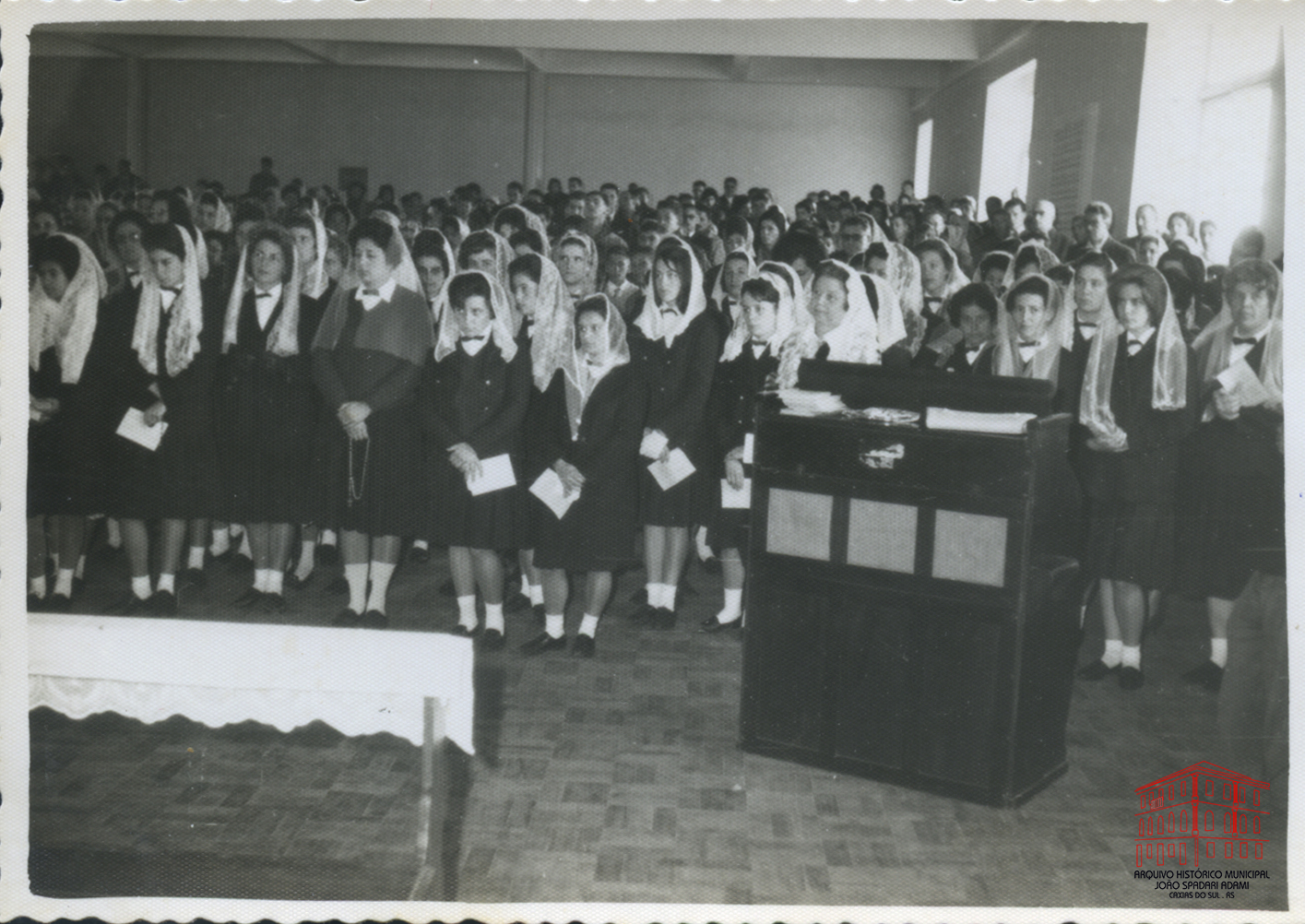 Cerimônia religiosa com a presença de alunas da Escola Normal Duque de Caxias