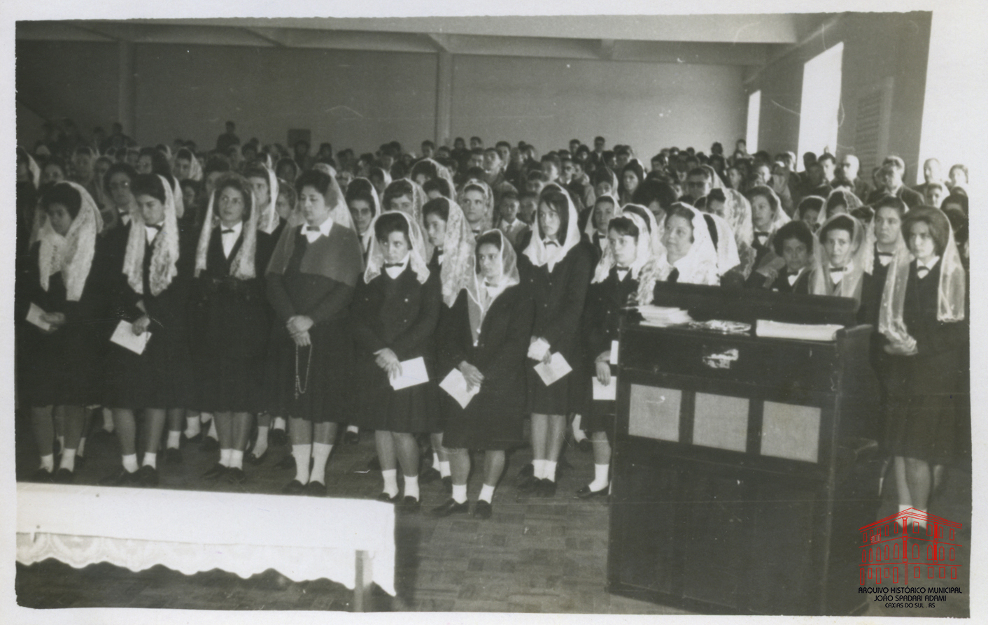 Cerimônia religiosa com a presença de alunas da Escola Normal Duque de Caxias.