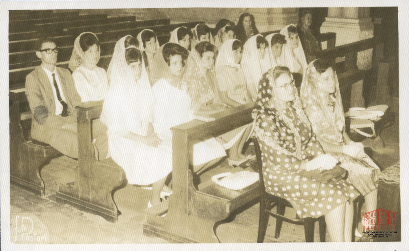 Grupo de pessoas em cerimônia religiosa. Ao lado do homem, professora Elaine Braguiroli Pisani.