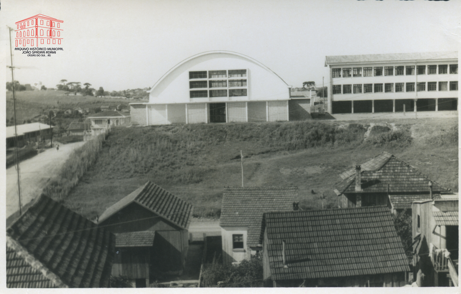 Vista dos fundos do ginásio e de um dos prédios do Colégio Estadual Cristóvão de Mendoza, situado na Avenida Júlio de Castilhos, onde atualmente funciona o Instituto Estadual de Educação Cristóvão de Mendoza