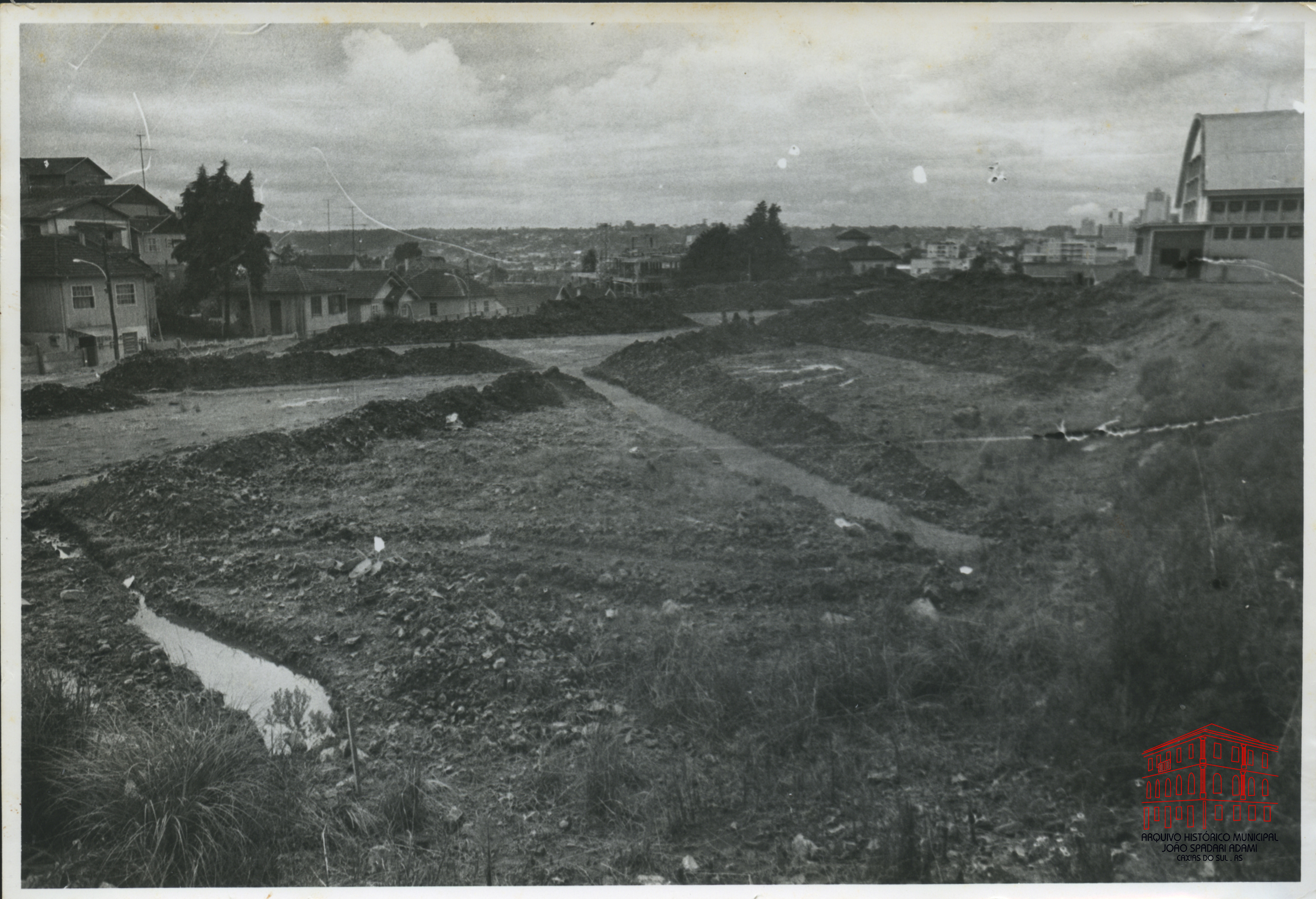 Obras no entorno do ginásio de esportes do Colégio Estadual Cristóvão de Mendoza (à direita), situado na Avenida Júlio de Castilhos, onde atualmente funciona o Instituto Estadual de Educação Cristóvão de Mendoza