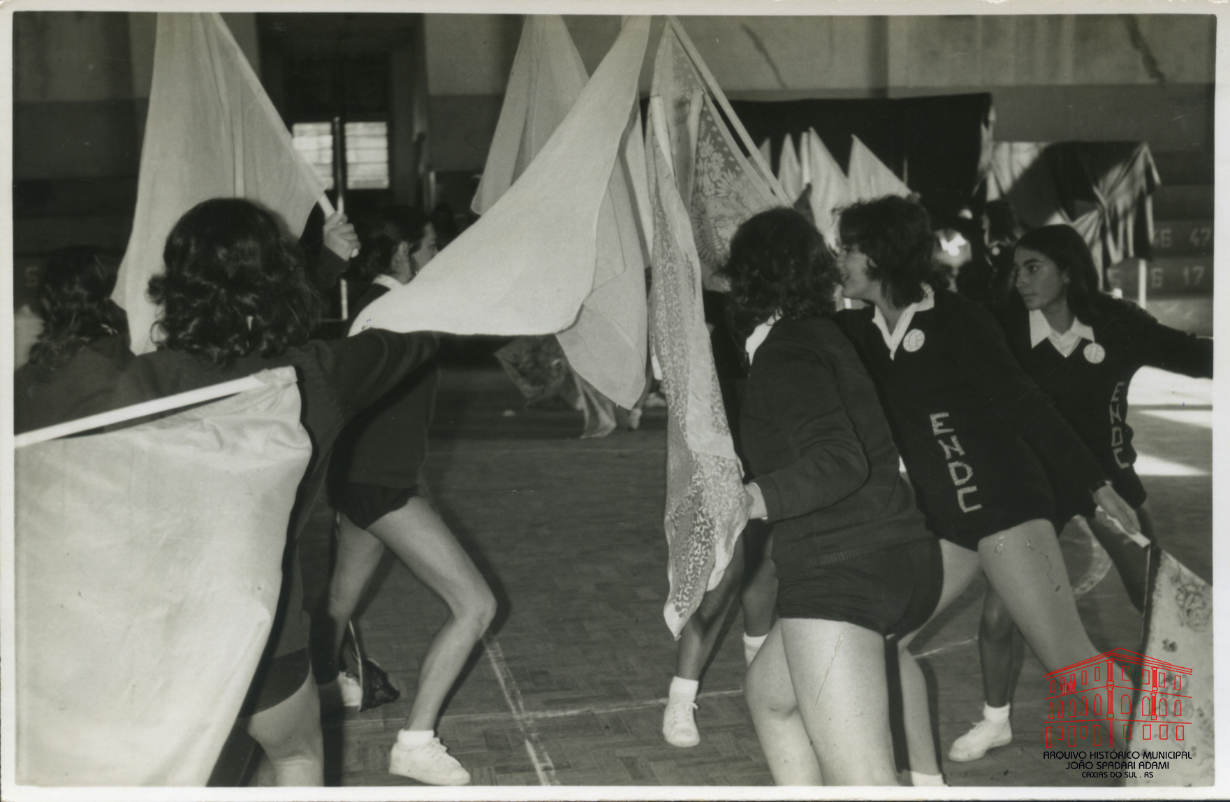 Alunas da Escola Normal Duque de Caxias em apresentação com bandeiras no ginásio de esportes da instituição, situado na Avenida Júlio de Castilhos, onde atualmente funciona o Instituto Estadual de Educação Cristóvão de Mendoza
