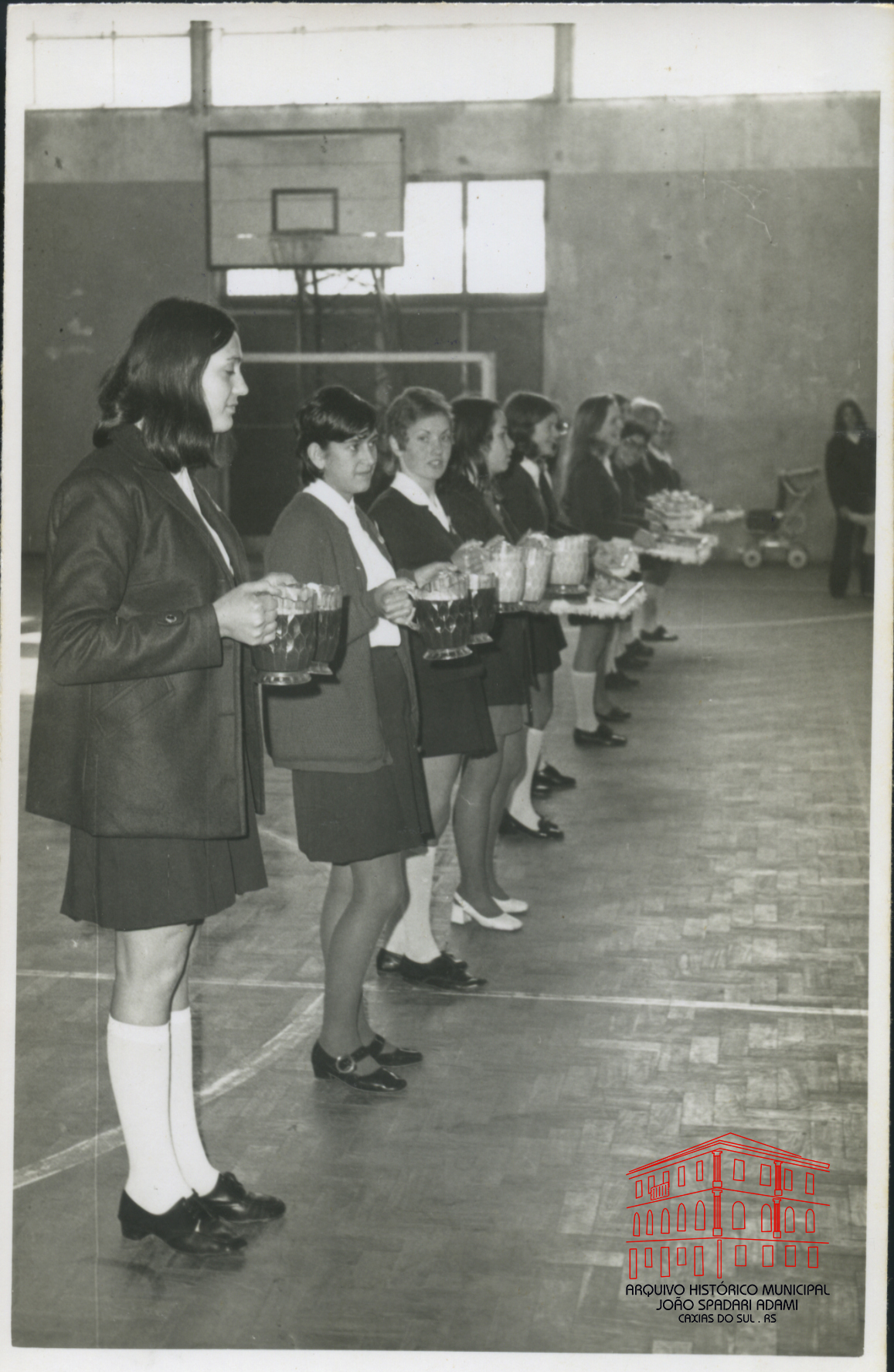 Alunas segurando jarras em atividade realizada no ginásio de esportes do Colégio Estadual Cristóvão de Mendoza, situado na Avenida Júlio de Castilhos, onde atualmente funciona o Instituto Estadual de Educação Cristóvão de Mendoza
