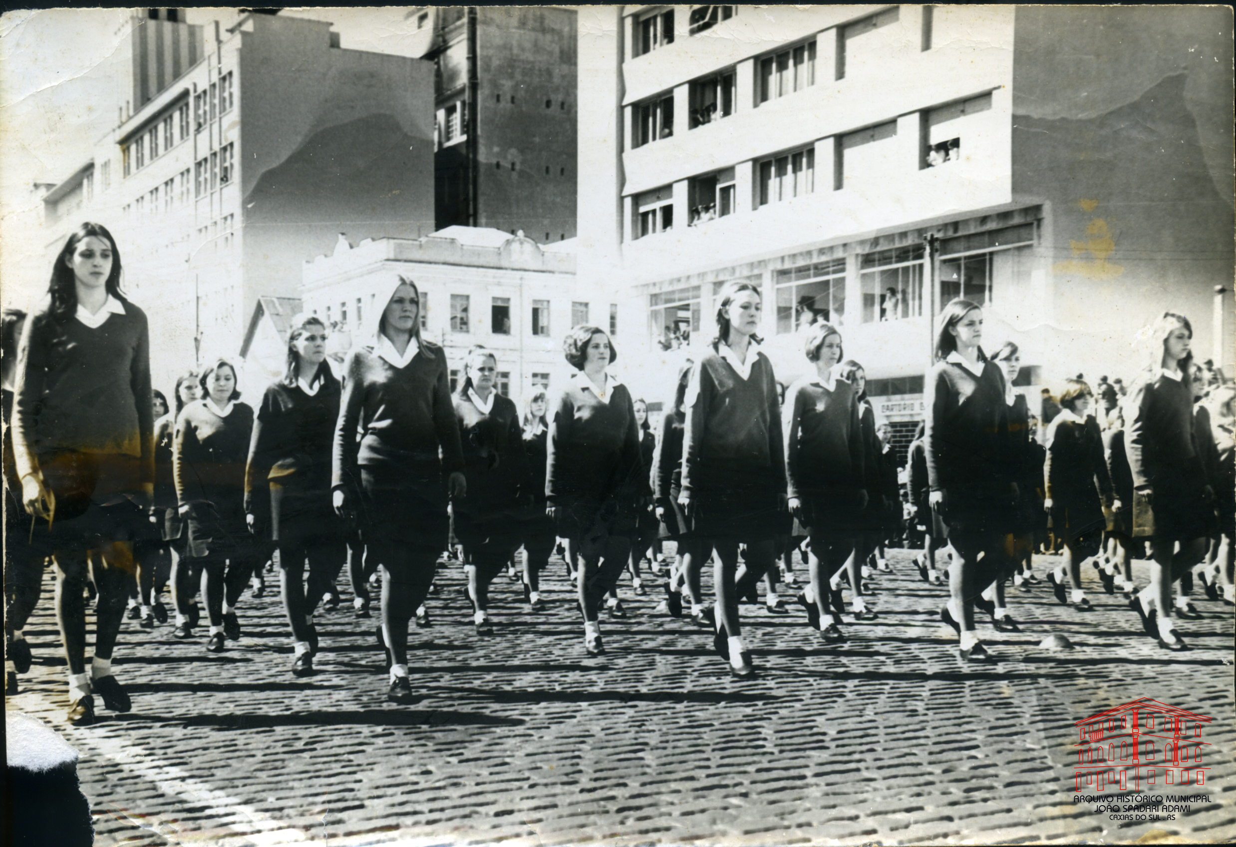 Alunas do Colégio Estadual Cristóvão de Mendoza no desfile cívico na rua Sinimbu, próximo à Catedral Diocesana.