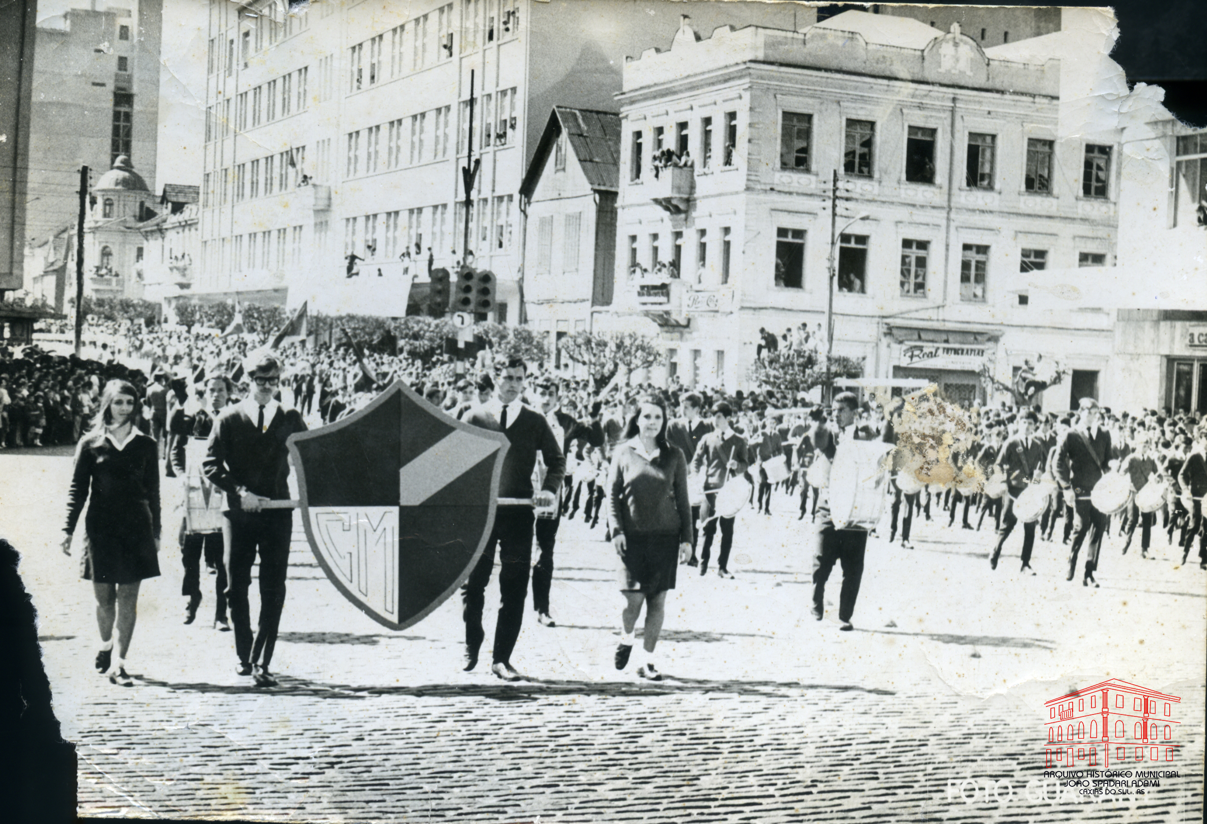 Alunos do Colégio Estadual Cristóvão de Mendoza no desfile cívico na rua Sinimbu, próximo à Catedral Diocesana.