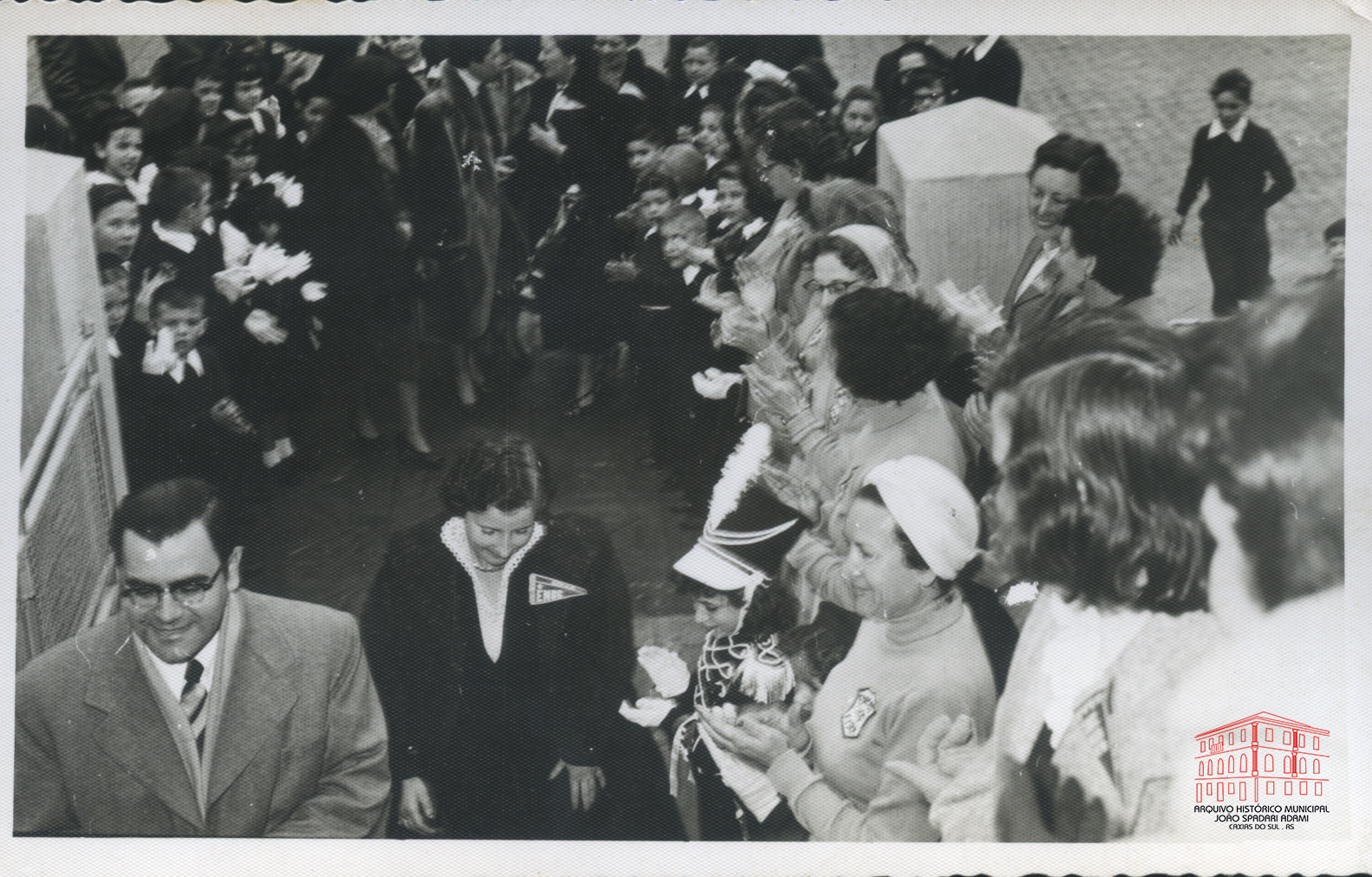 Chegada das autoridades nas comemorações do Jubileu de Prata da Escola Normal Duque de Caxias, ocorrida nos dias 02 e 03 de julho de 1955. À frente, Dr Liberato Salzano Vieira da Cunha, Secretário Estadual de Educação e Cultura e ao seu lado, Lígia Rosa, Diretora da Escola Normal Duque de Caxias.