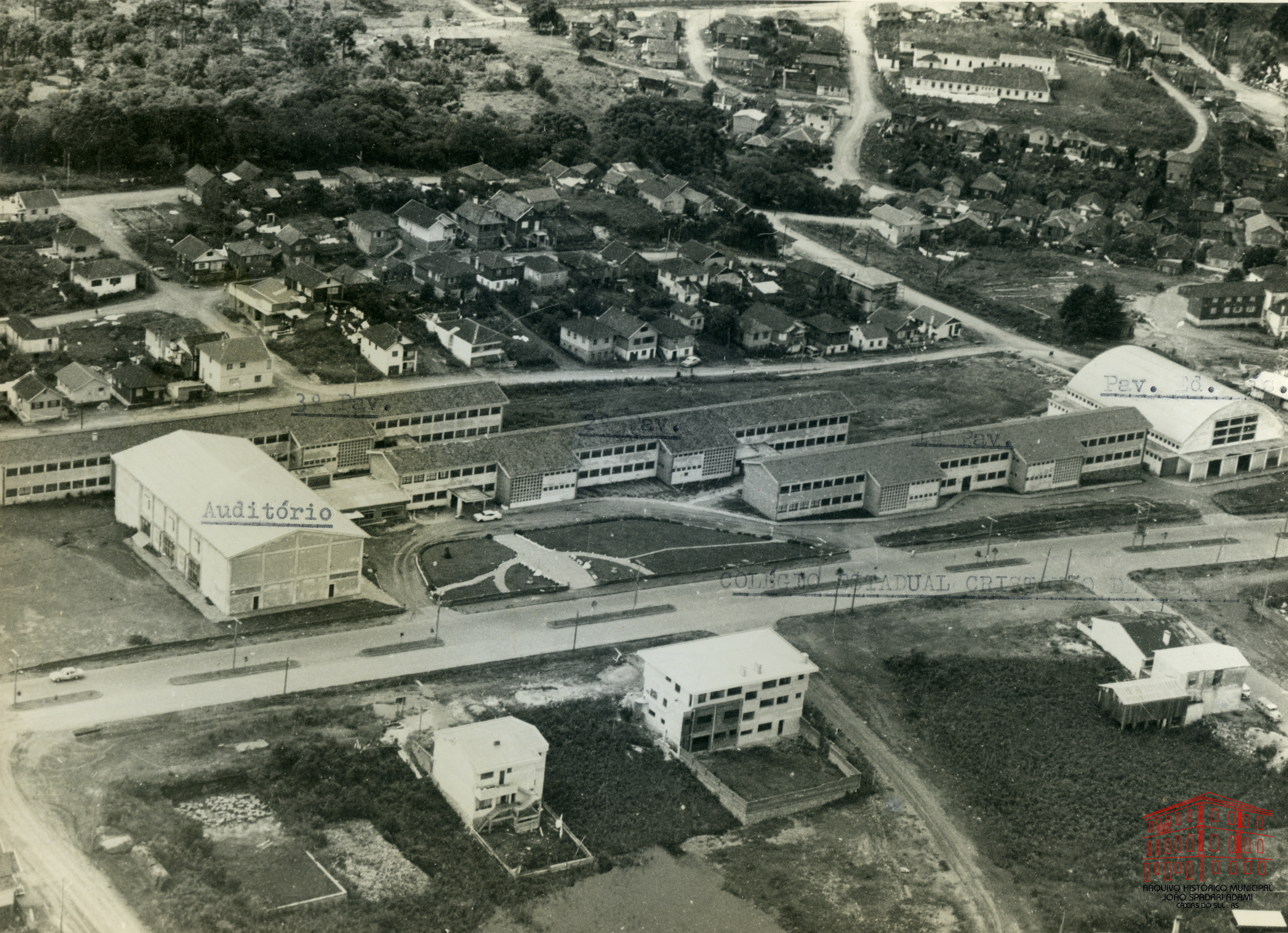 Vista aérea das fachadas do novo prédio da Escola Normal Duque de Caxias e Colégio Estadual Cristóvão de Mendoza, situado na Avenida Júlio de Castilhos, onde atualmente funciona o Instituto Estadual de Educação Cristóvão de Mendoza.