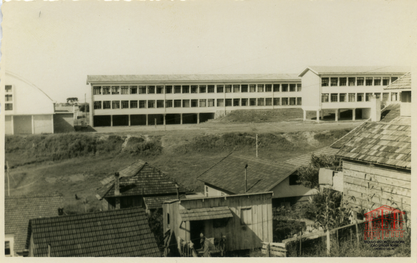 Vista parcial dos fundos de prédios e parte do ginásio da Escola Normal Duque de Caxias e Colégio Estadual Cristóvão de Mendoza, situado na Avenida Júlio de Castilhos, onde atualmente funciona o Instituto Estadual de Educação Cristóvão de Mendoza.