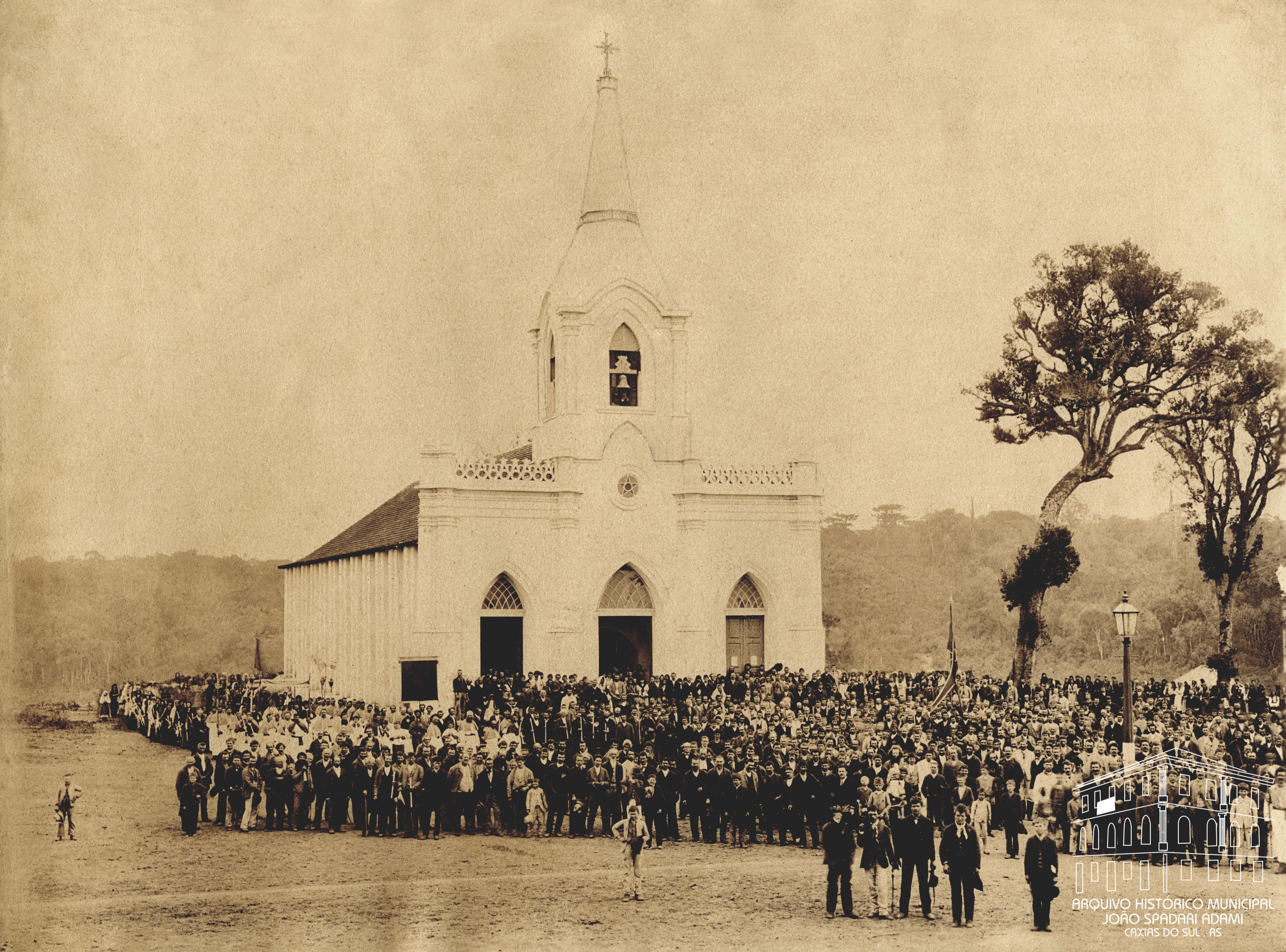 Solenidade de inauguração da nova Igreja São Luiz Gonzaga, construída pelo Governo Imperial, sob a supervisão de Júlio de Oliveira, diretor da colonização local.