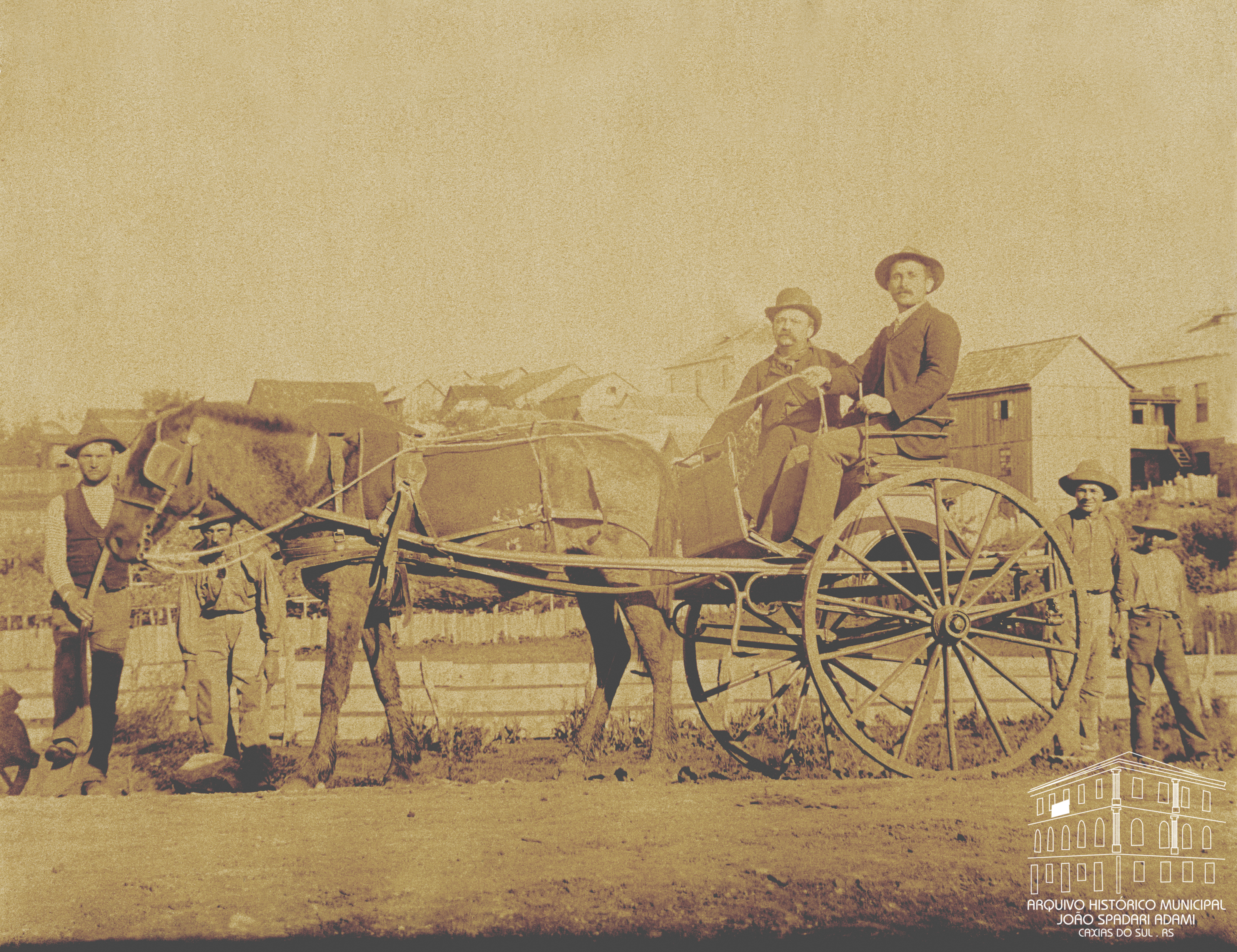 Homens em uma charrete na Colônia Caxias, atual município de Caxias do Sul.