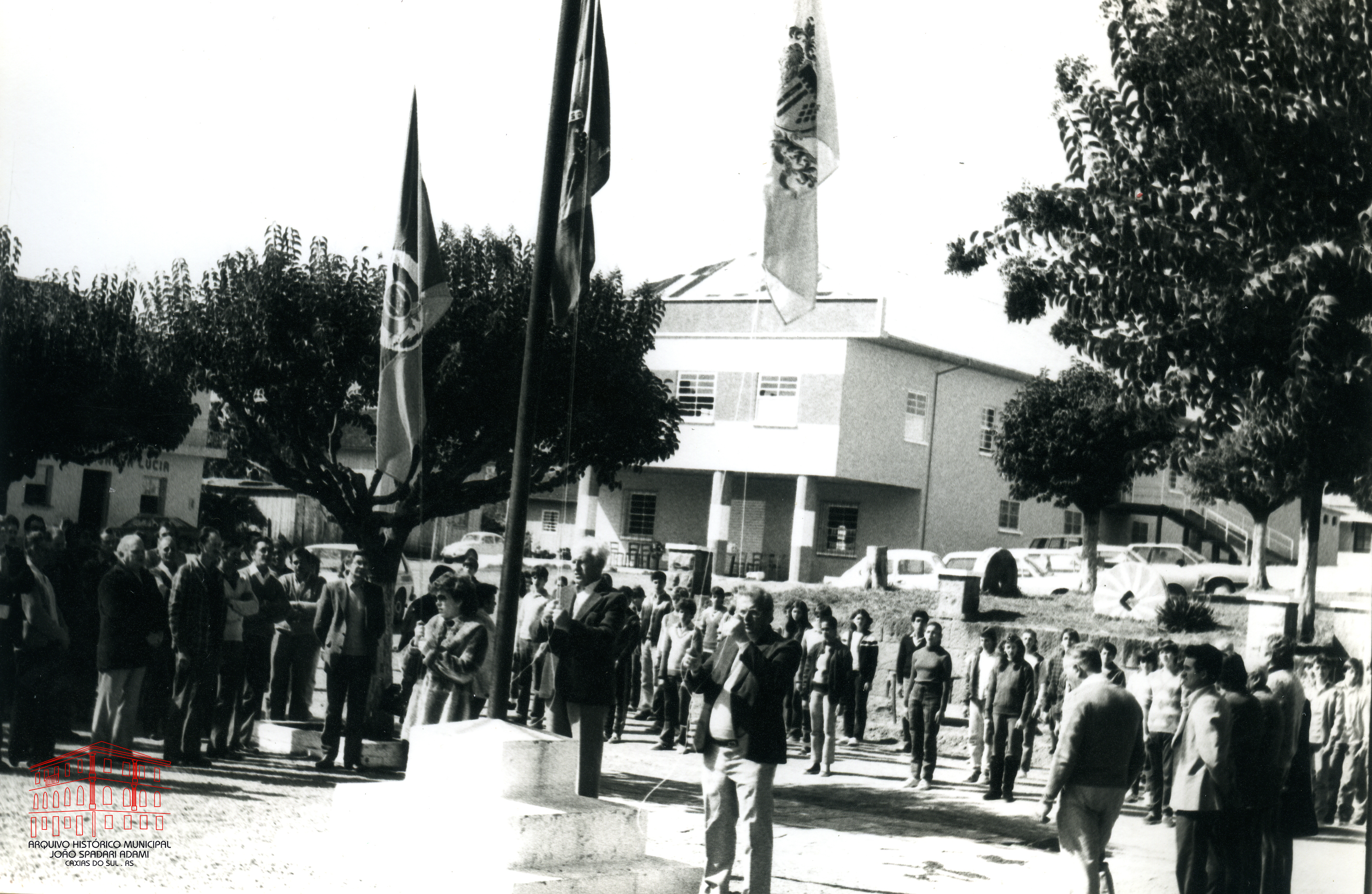 Autoridades e alunos no hasteamento das bandeiras na cerimônia de lançamento de Livro sobre a História de Santa Lúcia do Piaí durante as festividades da Semana da Pátria.