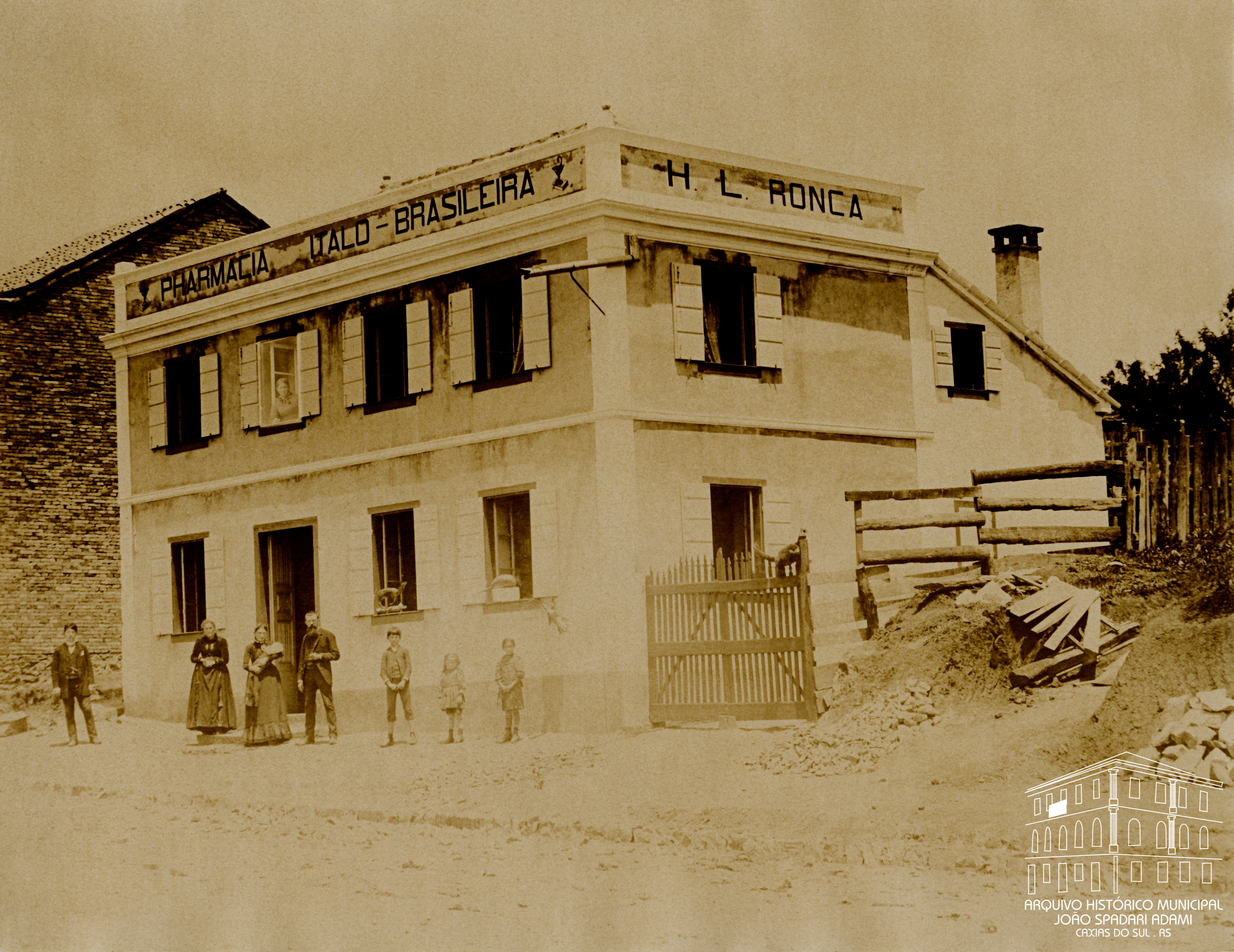 Hugo Luciano Ronca e familiares em frente à Farmácia Ítalo-Brasileira, de sua propriedade, a qual funcionou entre os anos de 1886 e 1903, na rua Silveira Martins, atual Avenida Júlio de Castilhos.