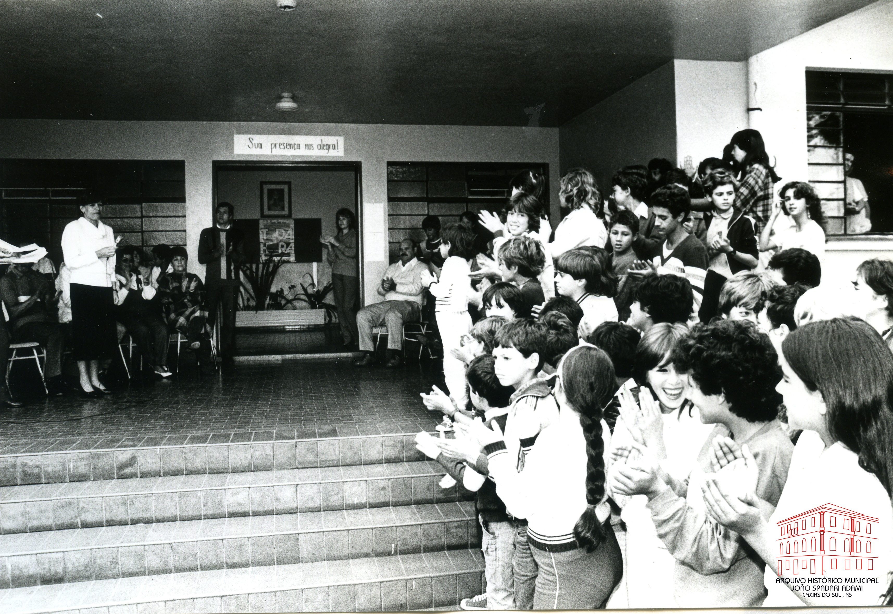 Ao microfone, Secretária Municipal da Educação e Cultura Marta Gobbato Trez na inauguração das obras de ampliação da Escola Municipal Papa João XXIII situada no bairro Salgado Filho, em 20 de maio de 1986.