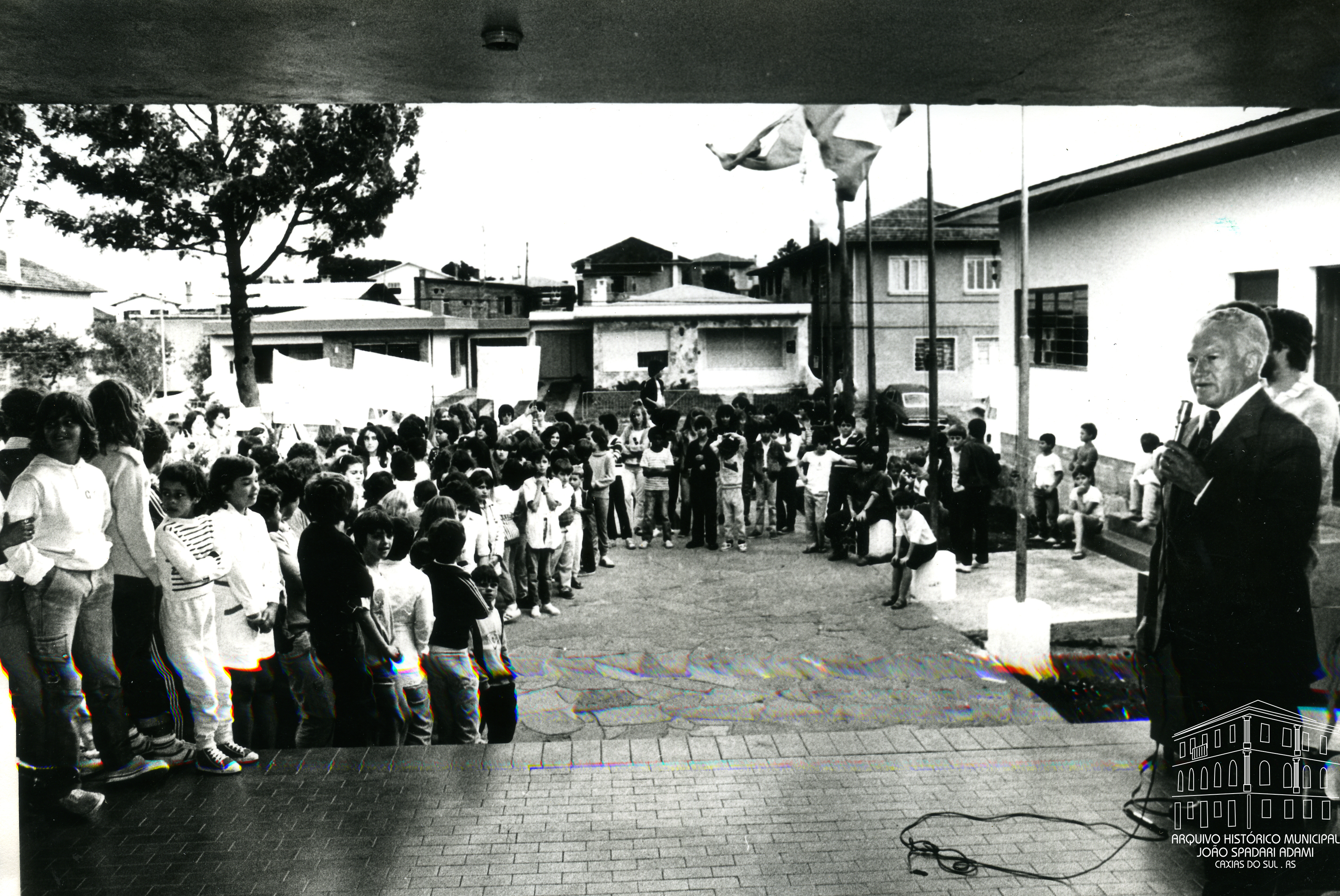 Ao microfone, Prefeito Victorio Trez na inauguração das obras de ampliação da Escola Municipal Papa João XXIII situada no bairro Salgado Filho, em 20 de maio de 1986.