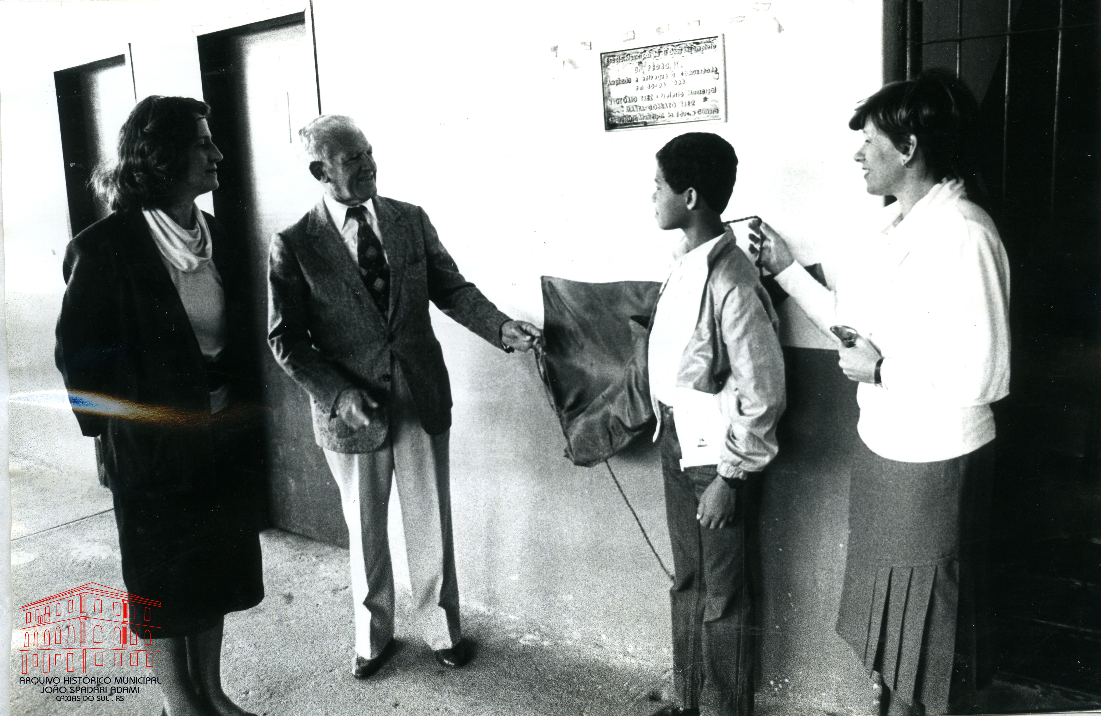 Inauguração da reforma do prédio da Escola Municipal Dom Pedro II, localizada no bairro De Lazzer, em 30 de abril de 1986. À esquerda, Prefeito Victorio Trez e, à direita, Secretária Municipal da Educação e Cultura, Marta Gobbato Trez.