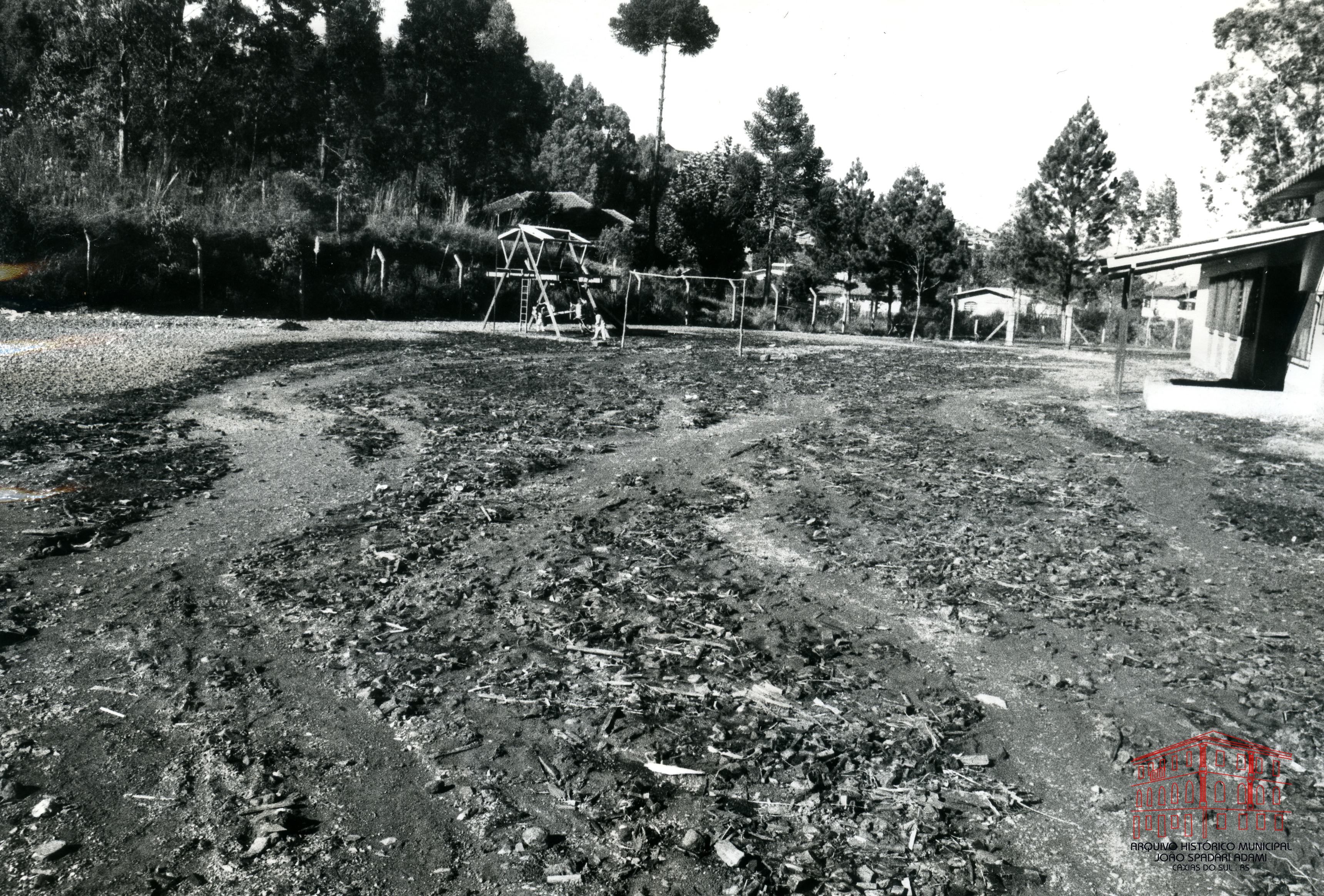 Prejuízos acarretados no pátio da Escola Municipal João de Zorzi, localizada no bairro Fátima Baixa, devido ao desmoronamento de barranco nas proximidades da escola.