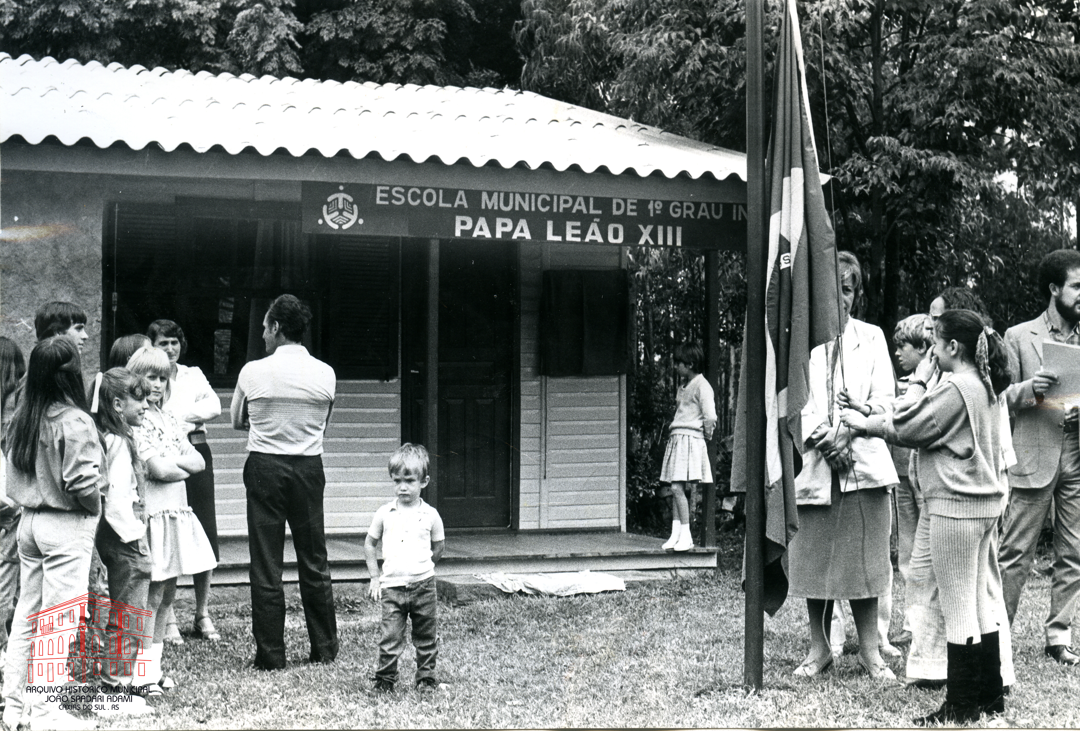 Hasteamento de bandeira na inauguração da Escola Municipal Papa Leão XIII, localizada na Zona Onzi, em Forqueta, em 06 de abril de 1986.