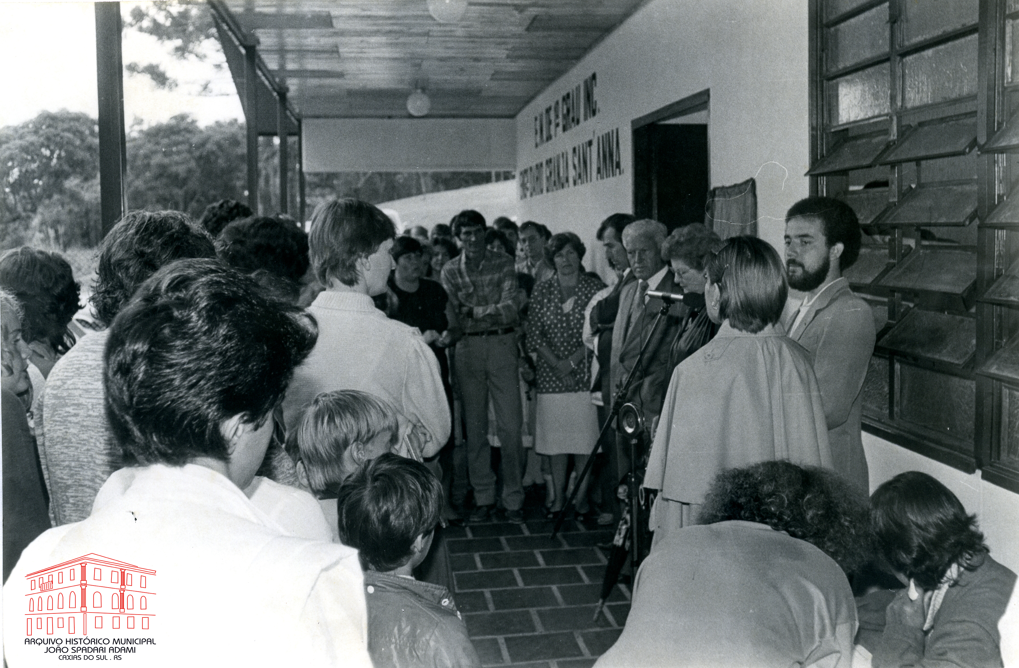 Autoridades e comunidade na inauguração do novo prédio da Escola Municipal Engenheiro Dario Granja Sant’ Anna, em 16 de março de 1986. Ao microfone, Secretária Municipal da Educação e Cultura, Marta Gobbato Trez.