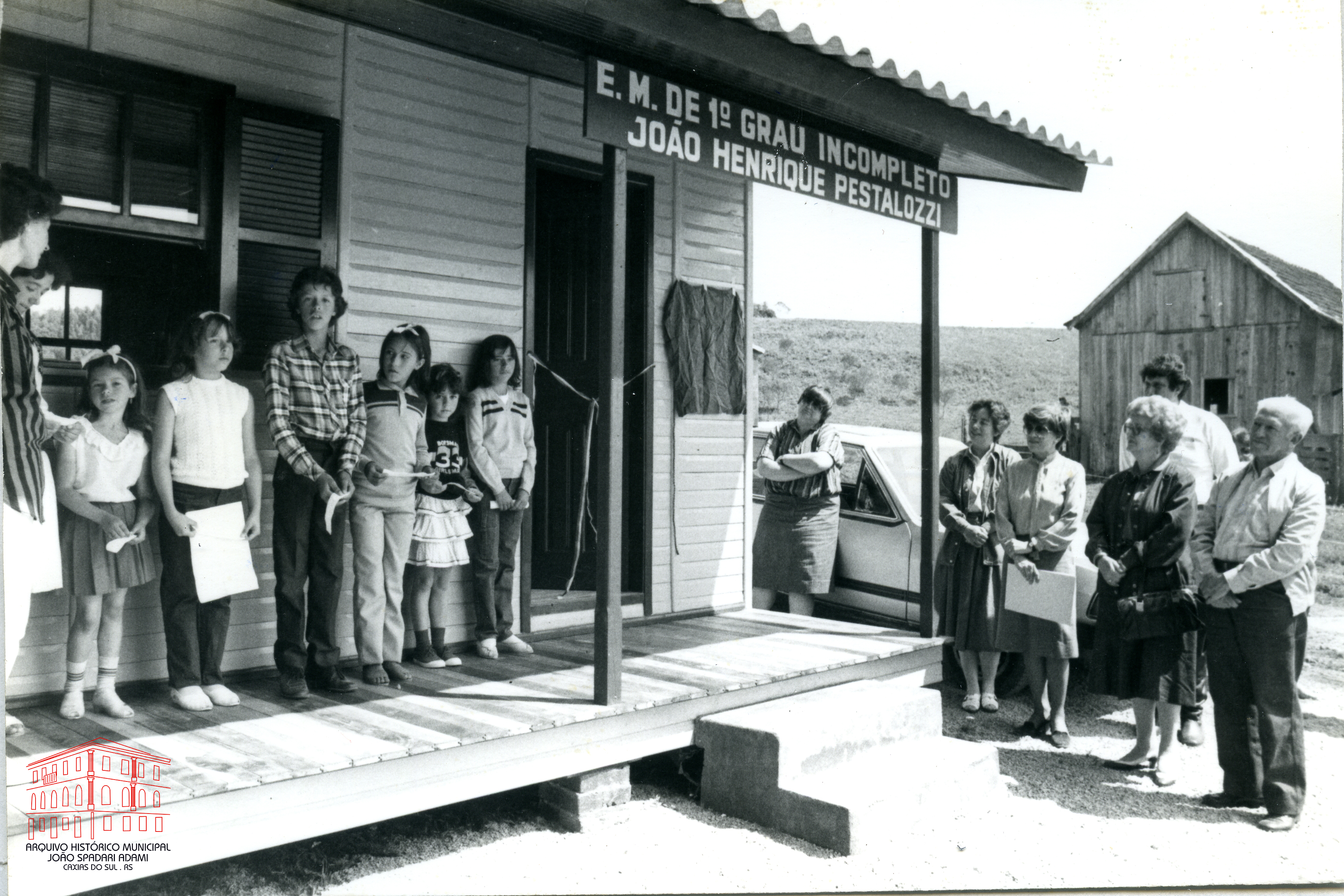 Inauguração do novo prédio da Escola Municipal João Henrique Pestalozzi, localizada em Ponte dos Ilhéus, distrito de Criúva, em 09 de novembro de 1985. À direita, Prefeito Victorio Trez , esposa do Prefeito Arilde Trez e Secretária Municipal da Educação e Cultura, Marta Gobbato Trez. Na porta do carro, Vereadora Geni Petteffi.