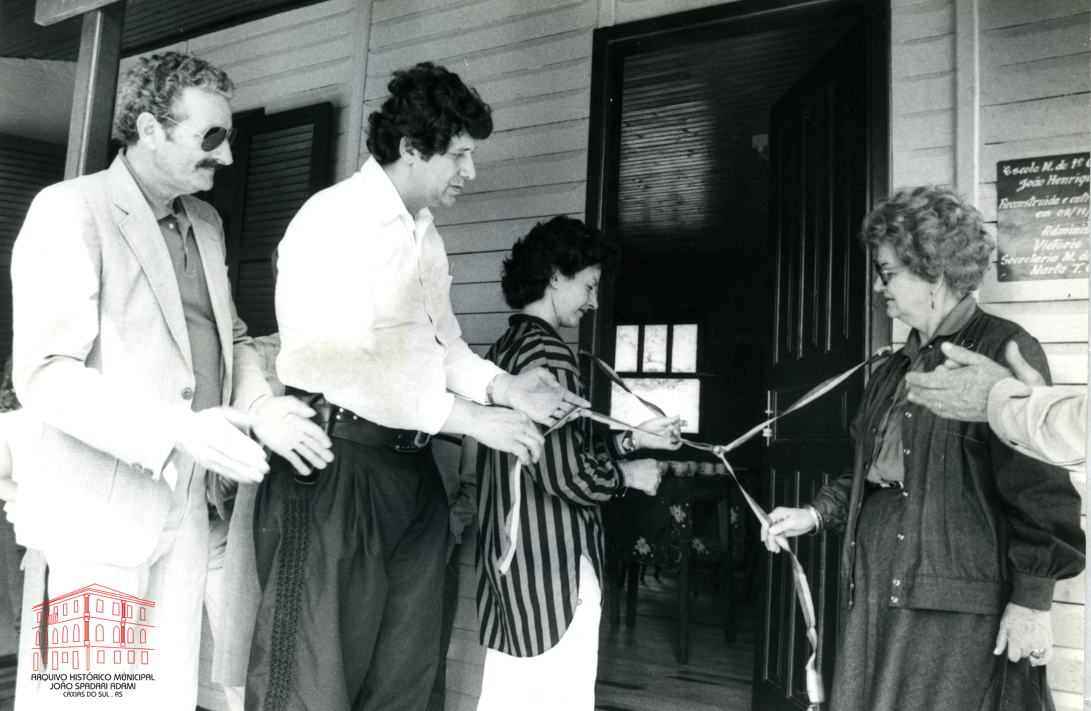 Inauguração do novo prédio da Escola Municipal João Henrique Pestalozzi, localizada em Ponte dos Ilhéus, distrito de Criúva, em 09 de novembro de 1985. À direita, Arilde Trez, esposa do Prefeito.