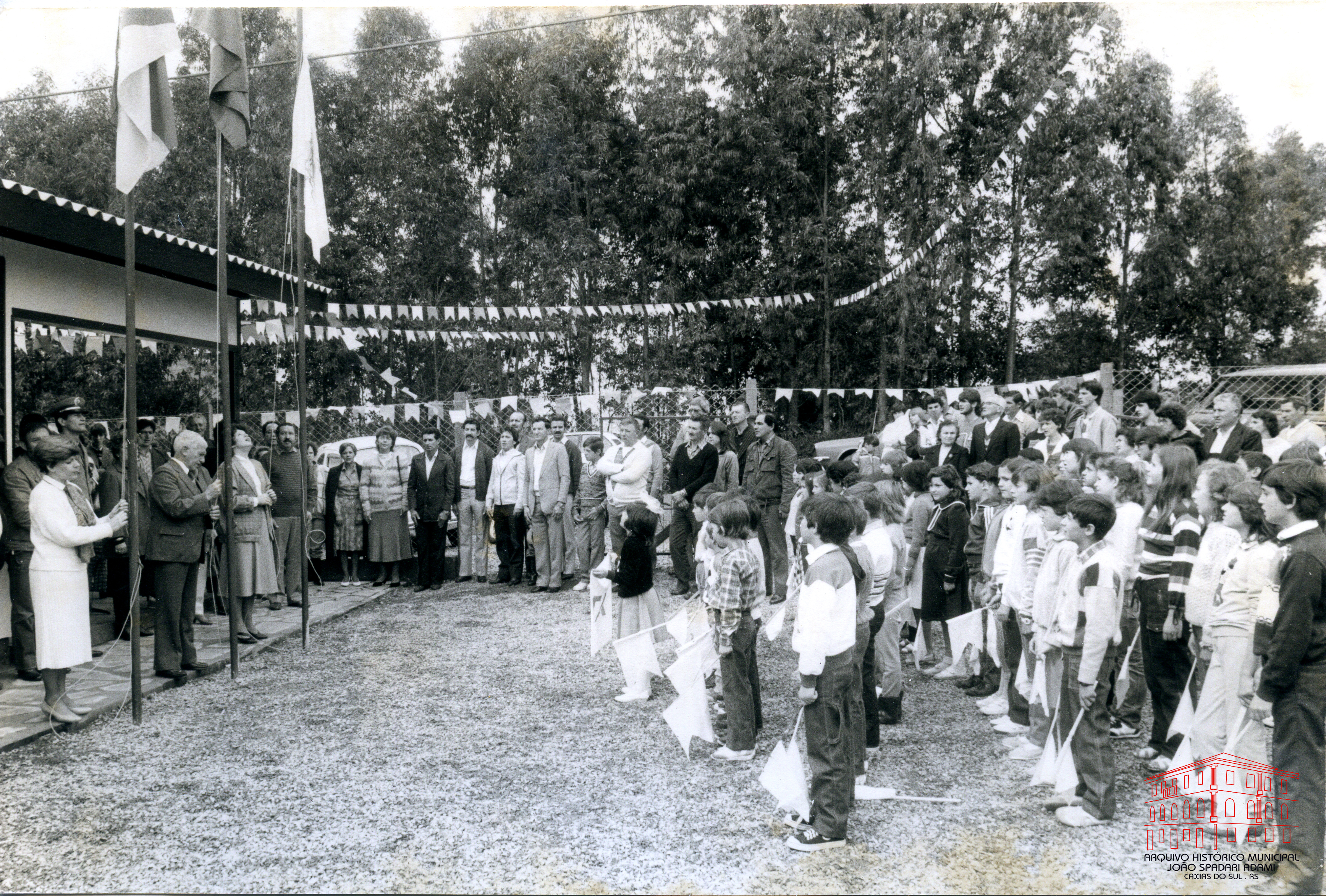 Hasteamento de bandeiras na inauguração da Escola Municipal Sete de Setembro, localizada em São Luiz da 6ª Légua, em 18 de agosto de 1985. À esquerda, Secretária Municipal da Educação e Cultura, Marta Gobbato Trez e, ao seu lado, Prefeito Victorio Trez. Autoria: Antônio Carlos Galvão