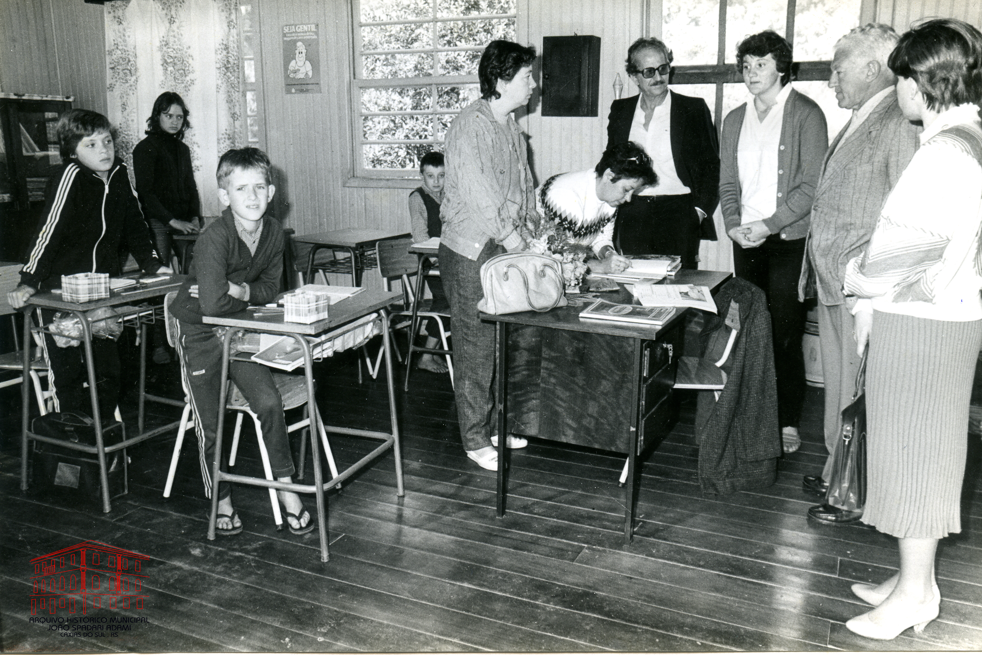 Inauguração das reformas na Escola Municipal Marechal Floriano Peixoto, localizada na Linha Barros Pimentel, Travessão Santa Tereza, em Galópolis, no dia 06 de agosto de 1985. À direita, Prefeito Victorio Trez e a Secretária Municipal da Educação e Cultura, Marta Gobbato Trez.