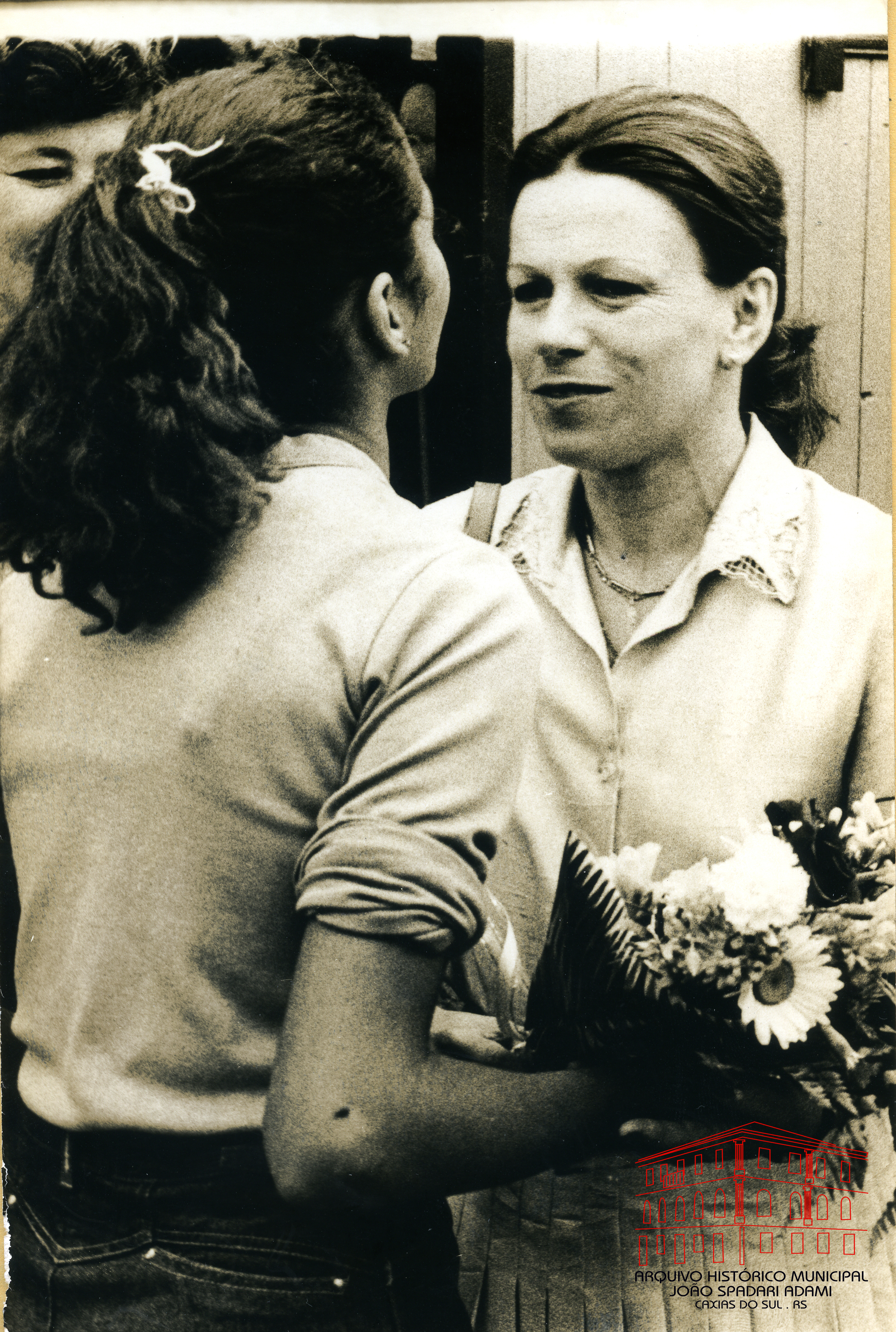 Secretária Municipal da Educação e Cultura, Marta Gobbato Trez na inauguração da restauração e ampliação da Escola Municipal Arnaldo Balvê, localizada em Santa Lúcia, 9ª Légua, em 17 de dezembro de 1983.