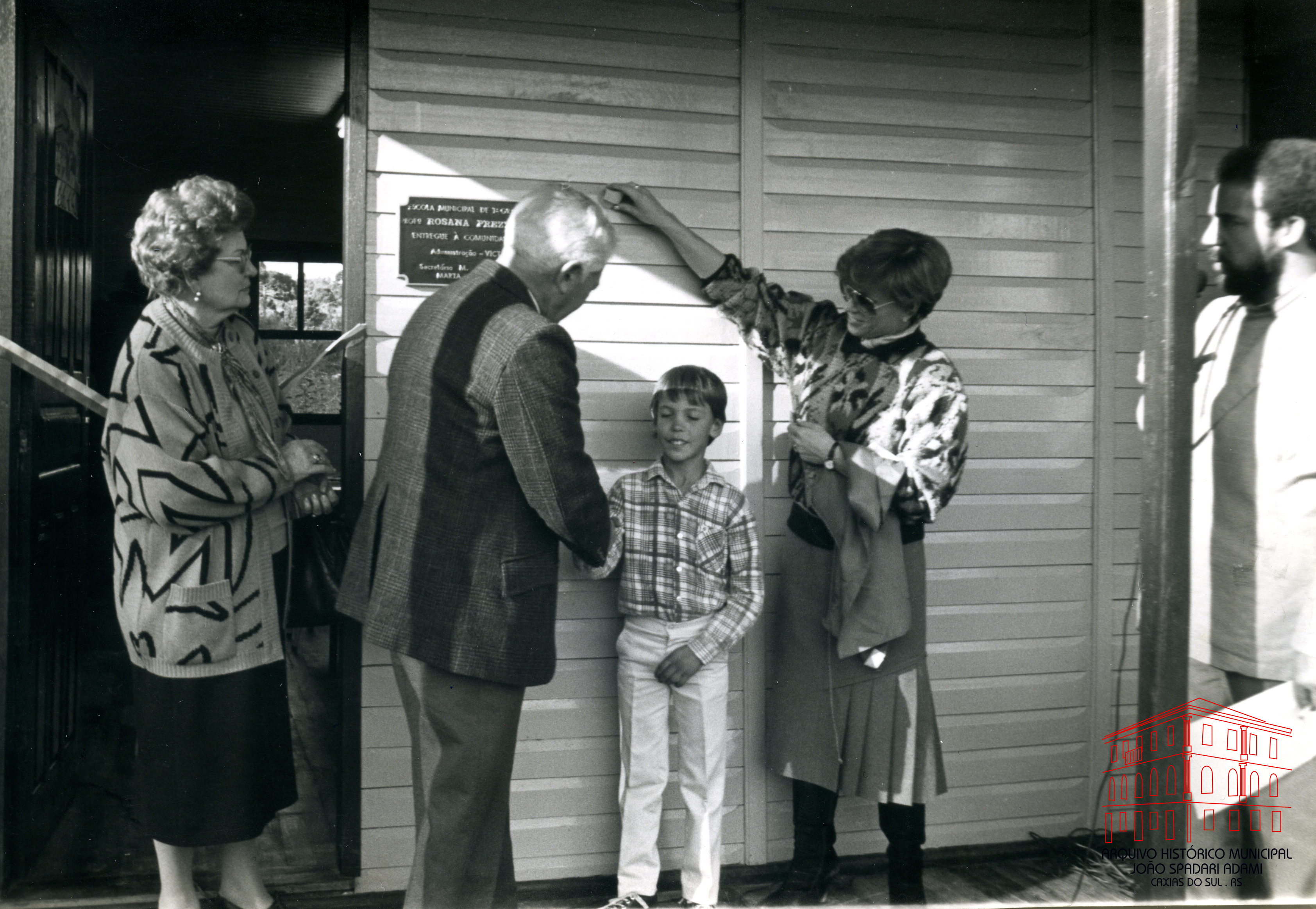 Esposa do Prefeito, Sra Arilde Trez, Prefeito Victorio Trez e Secretária Municipal da Educação e Cultura, Marta Gobbato Trez no descerramento da placa inaugural da Escola Municipal Rosana Prezzi Batisti, localizada em São José da 6ª Légua, no dia 27 de junho de 1987.