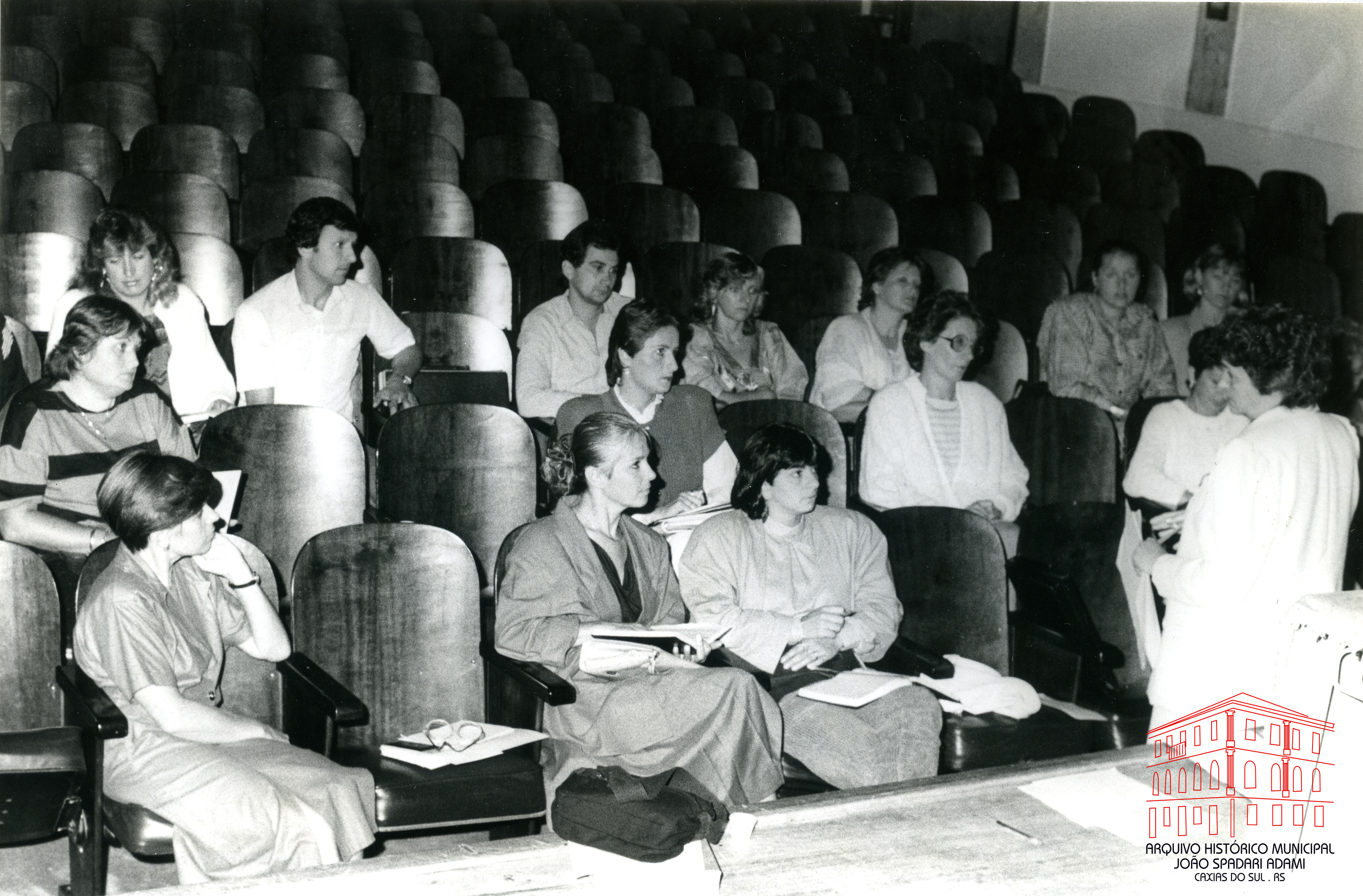 Encontro de Secretários Municipais da Educação da AMESNE realizado na Casa da Cultura Percy Vargas de Abreu e Lima, em 23 de abril de 1987. Na primeira fila à esquerda, Secretária Municipal da Educação e Cultura, Marta Gobbato Trez