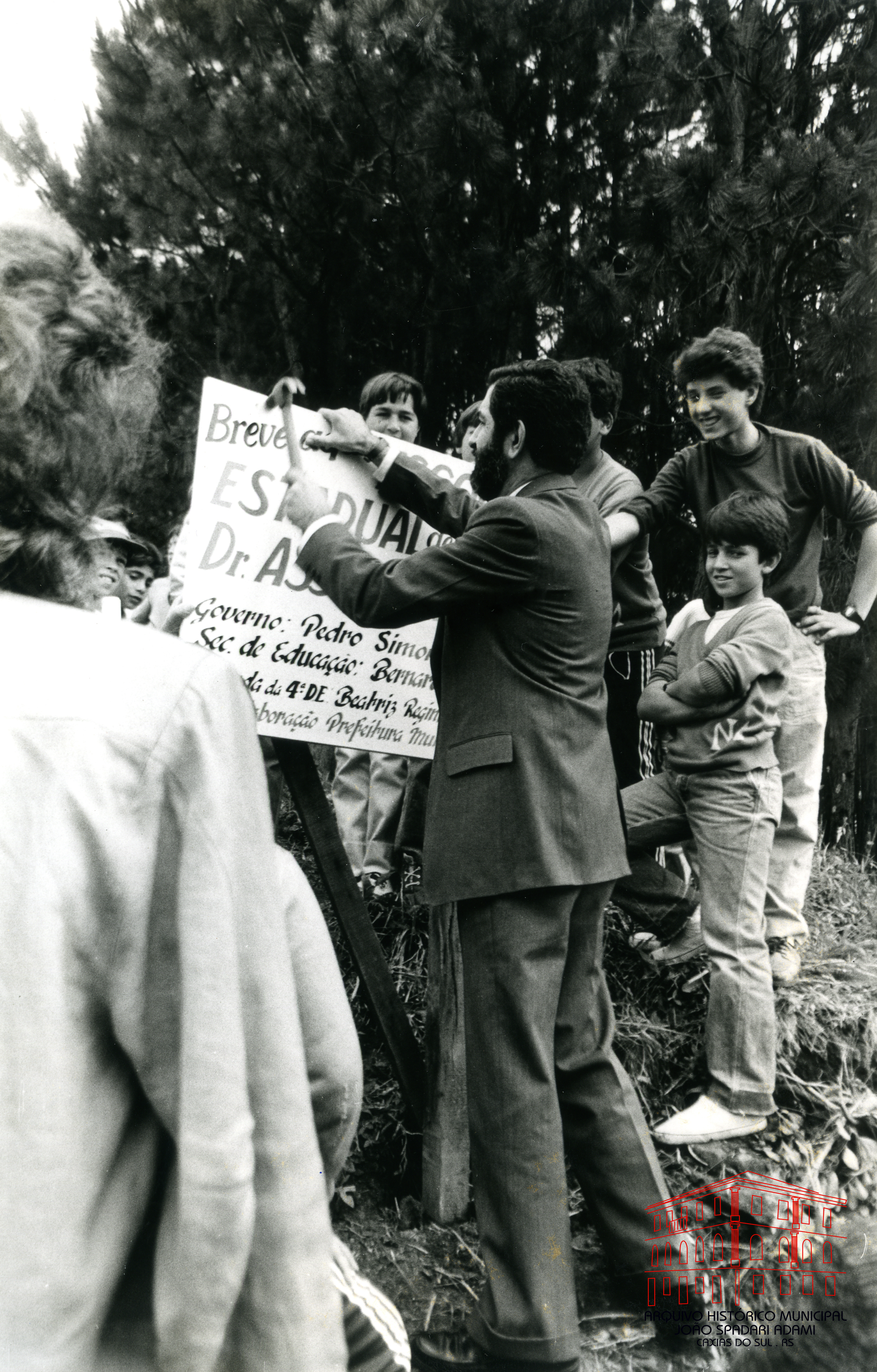 Secretário de Estado da Educação, Bernardo de Souza pregando placa no local da construção da Escola Estadual Assis Mariani. Colaboração: Prefeitura de Caxias do Sul.