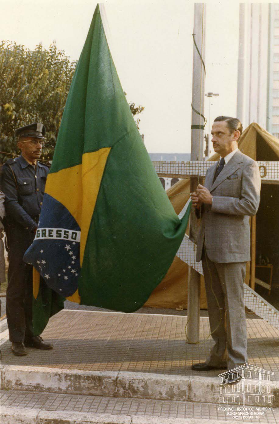 Hasteamento e arriamento das Bandeiras na Praça Rui Barbosa, atual Praça Dante Alighieri, durante a Semana da Pátria.