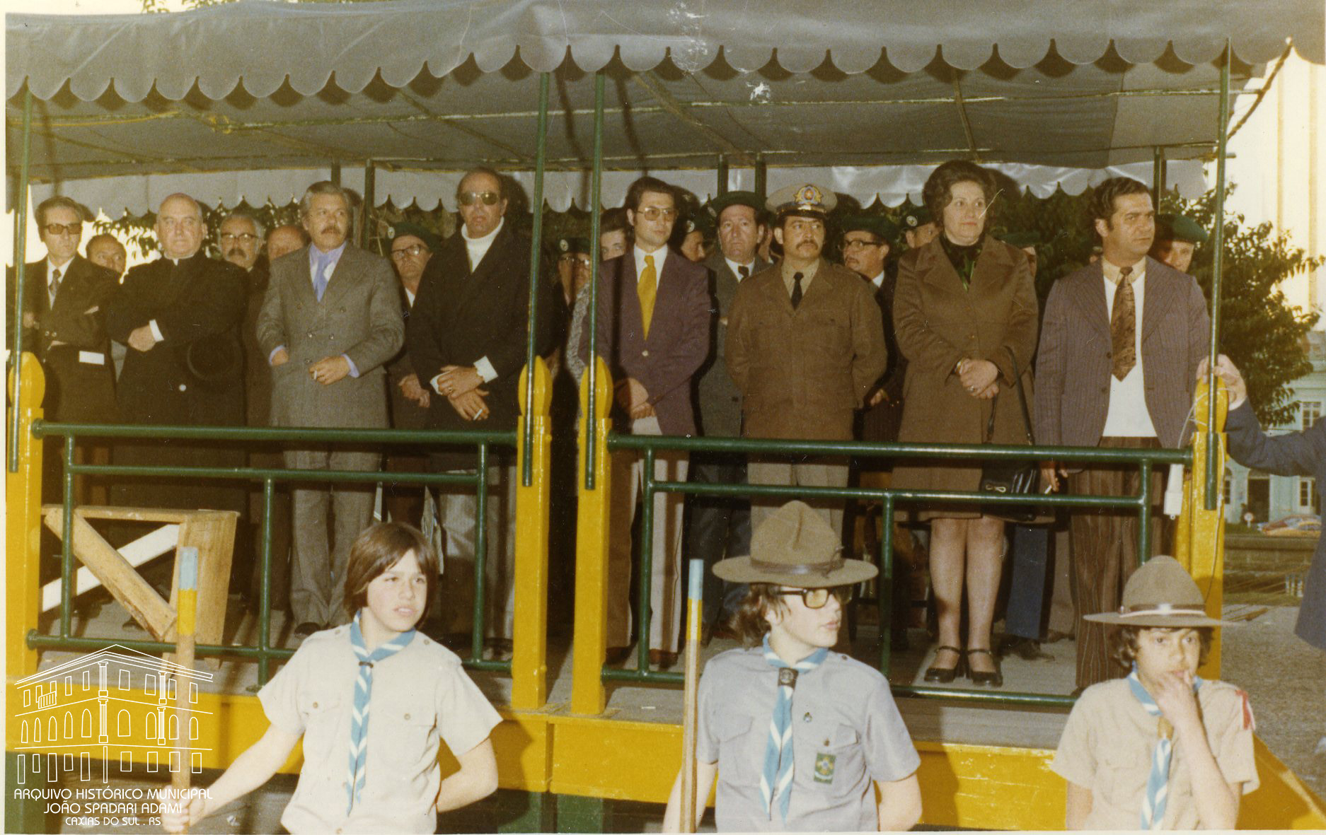 Autoridades na solenidade de encerramento da Semana da Pátria 1973. Da esquerda para direita,2º Bisbo Dom Benedito Zorzi, 3º Prefeito Mário Bernardino Ramos, 5º vice-prefeito Mário David Vanin e 7ª Santina Barp Amorim, Secretária Municipal da Educação e Cultura.