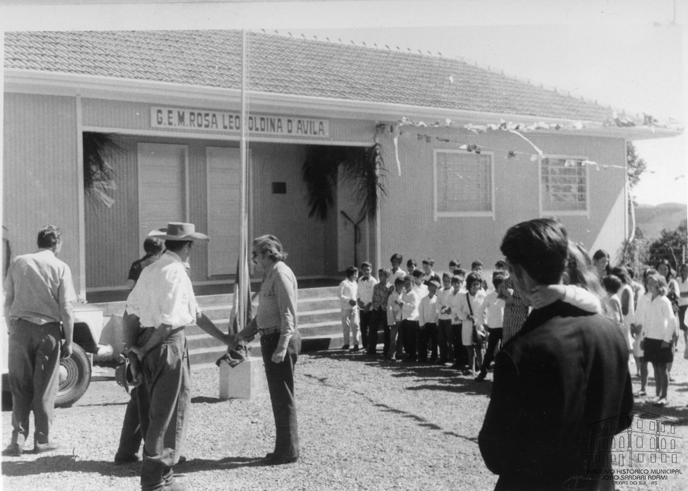 Inauguração do Grupo Escolar Municipal Rosa Leopoldina de Almeida Ávila localizado no Fundo do Agudo, distrito de Criúva, em 25 de março de 1973. Início da obra em fevereiro e Fase final da obra do Grupo Escolar Municipal término em março de 1973. Ao centro, Prefeito Mário Bernardino Ramos.