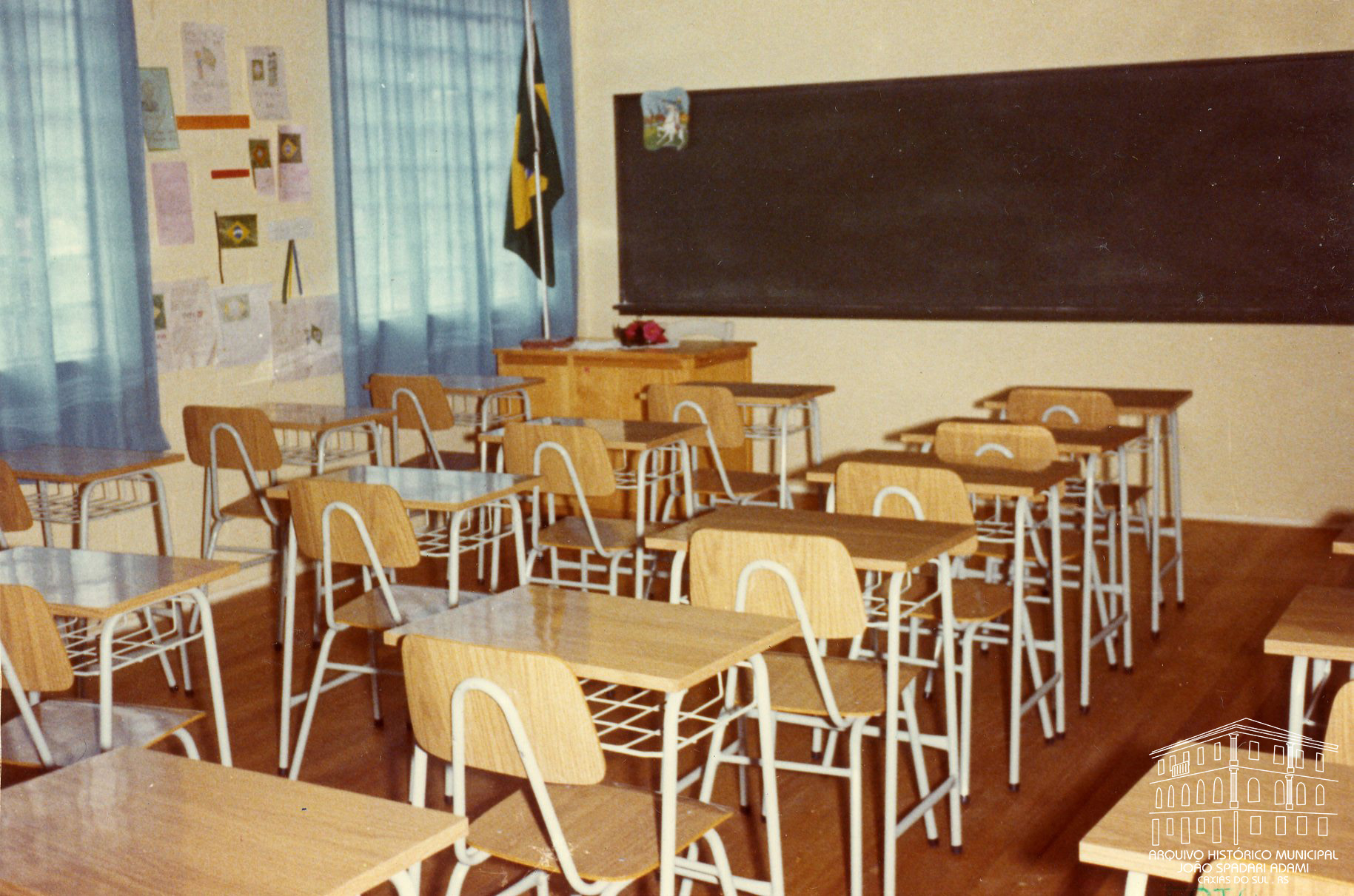 Interior da sala de aula do Grupo Escolar Municipal Alberto Pasqualini, localizado no bairro Bela Vista, em 06 de setembro de 1973