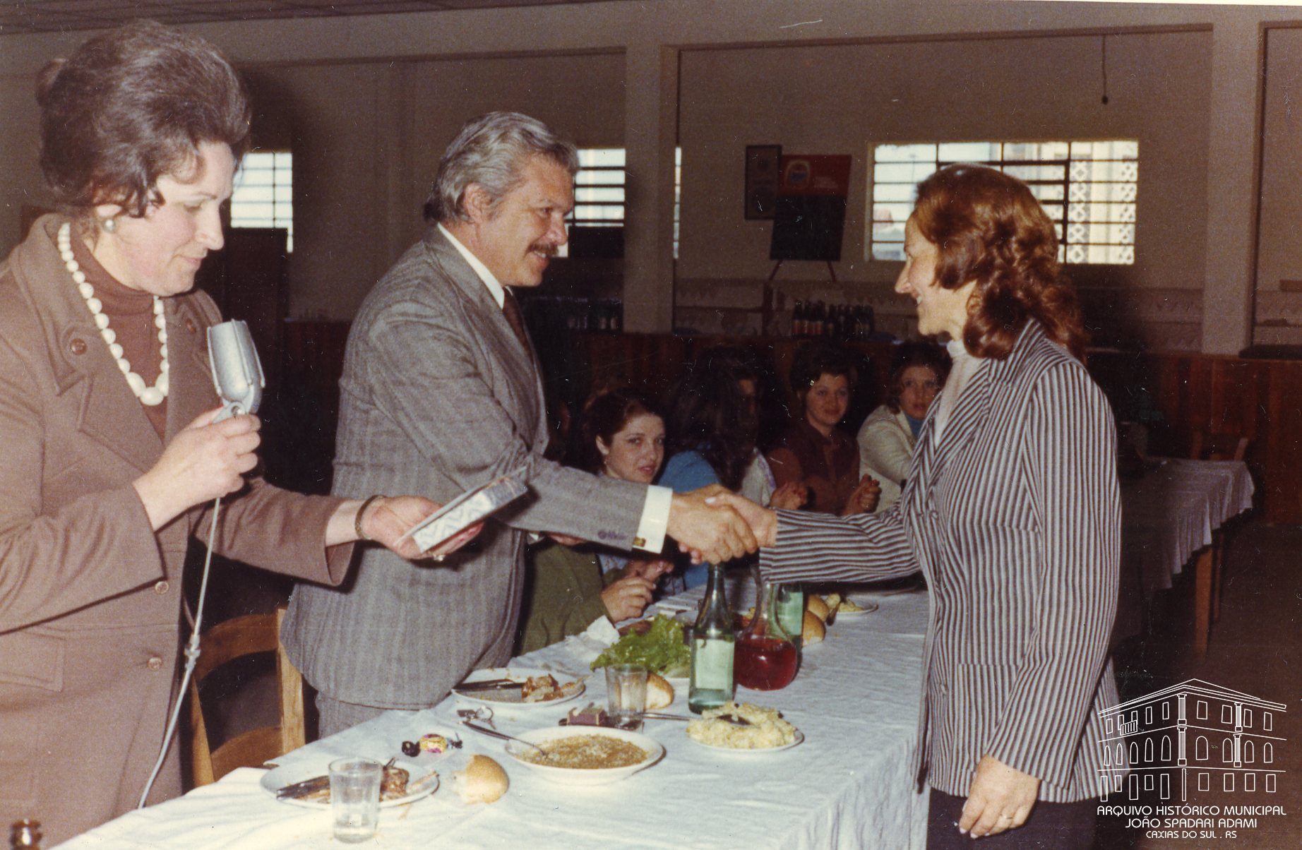 Prefeito Mário Bernardino Ramos na entrega do cartão de prata aos professores municipais aposentados, no dia 15 de outubro de 1973. Ao microfone, Santina Barp Amorim, Secretária Municipal da Educação e Cultura.
