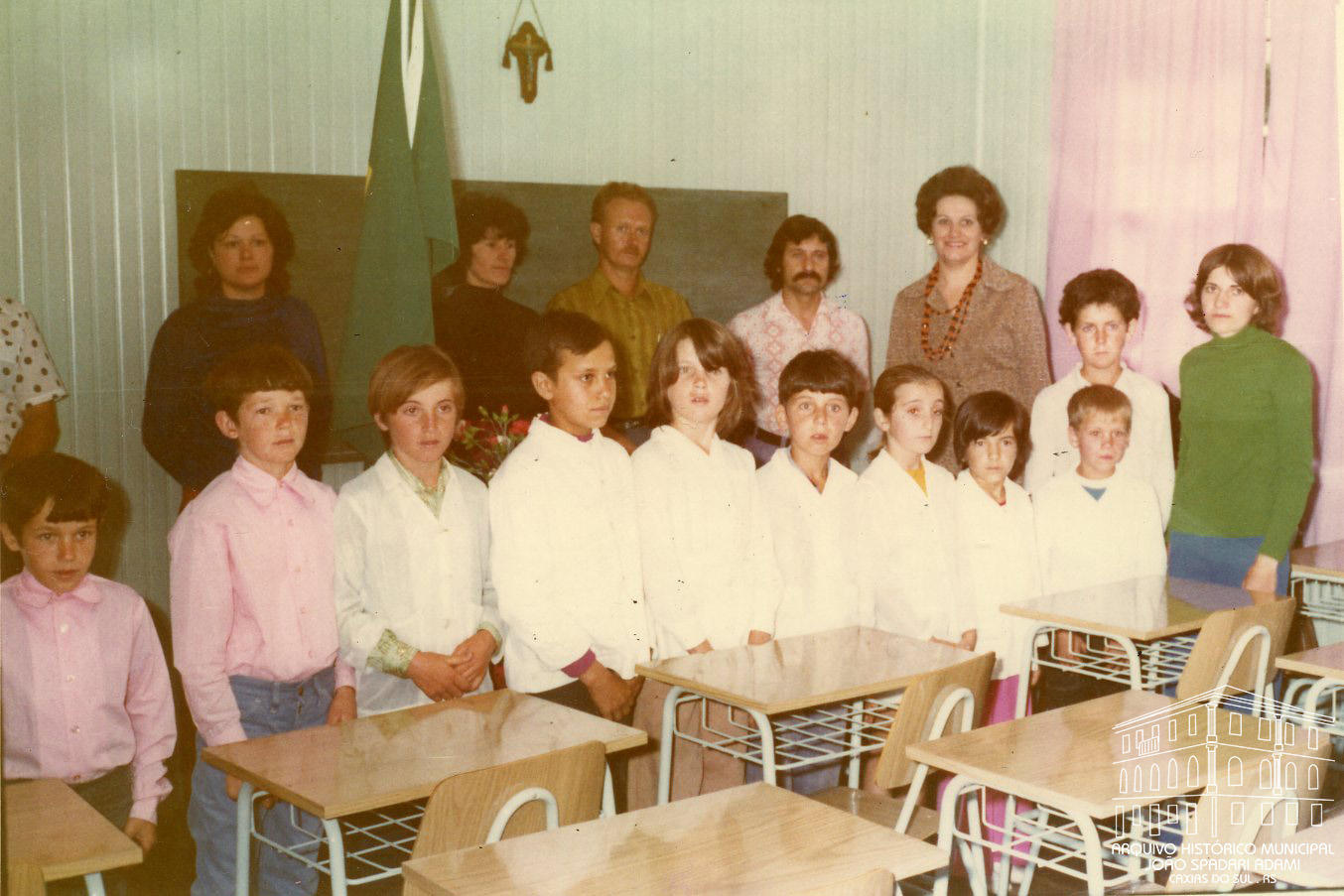 Autoridades, alunos e professora no interior da Escola Municipal Maximiliano Pasquali localizada em São Roque, Distrito de Fazenda Souza, em dezembro de 1974, data da inauguração. De colar, Santina Barp Amorim, Secretária Municipal da Educação e Cultura.